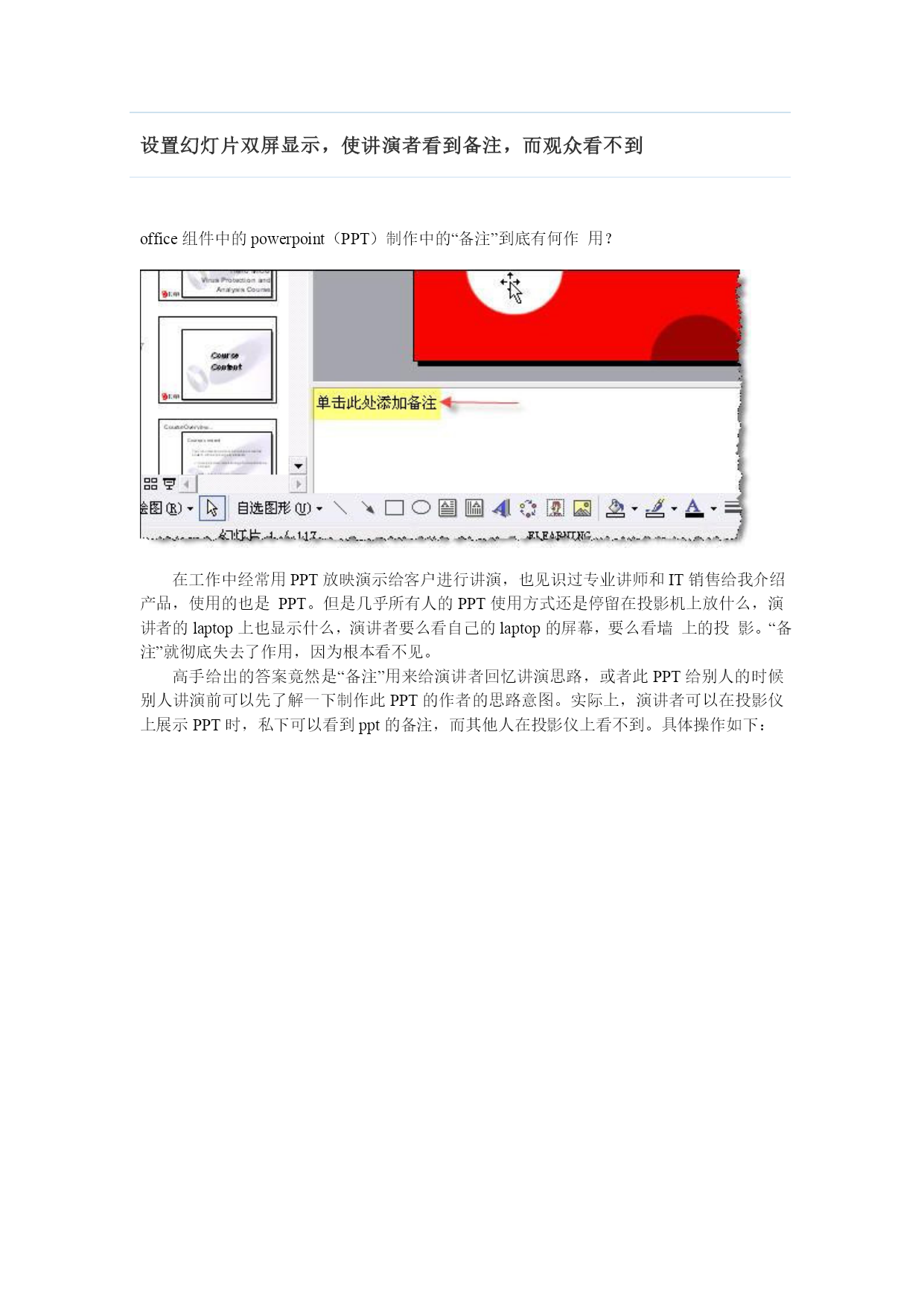 设置幻灯片双屏显示,使讲演者看到备注,而观众看不到office组件中的powerpoint(PPT)制作中的“备注”到底有何作用?在工作中经常用PPT放映演示给客户进行讲演,也见识过专业讲师和IT销售给我介绍产品,使用的也是PPT。但是几乎所有人的PPT使用方式还是停留在投影机上放什么,演讲者的laptop上也显示什么,演讲者要么看自己的laptop的屏幕,要么看墙上的投影。“备注”就彻底失去了作用,因为根本看不见。高手给出的答案竟然是“备注”用来给演讲者回忆讲演思路,或者此PPT给别人的时候别人讲演前可
