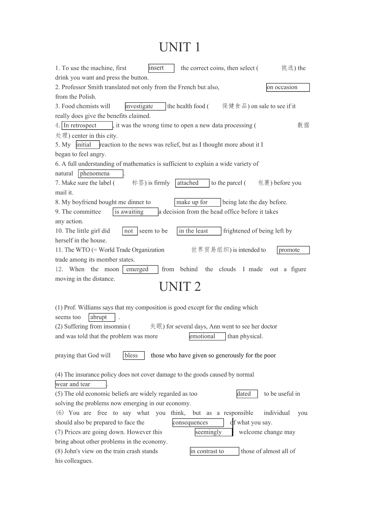 UNIT11.Tousethemachine,firstinsertthecorrectcoins,thenselect(挑选)thedrinkyouwantandpressthebutton.2.ProfessorSmithtranslatednotonlyfromtheFrenchbutalso,onoccasionfromthePolish.3.Foodchemistswillinvestigatethehealthfood(保健食品)onsaletoseeifitreallydoesgivethe