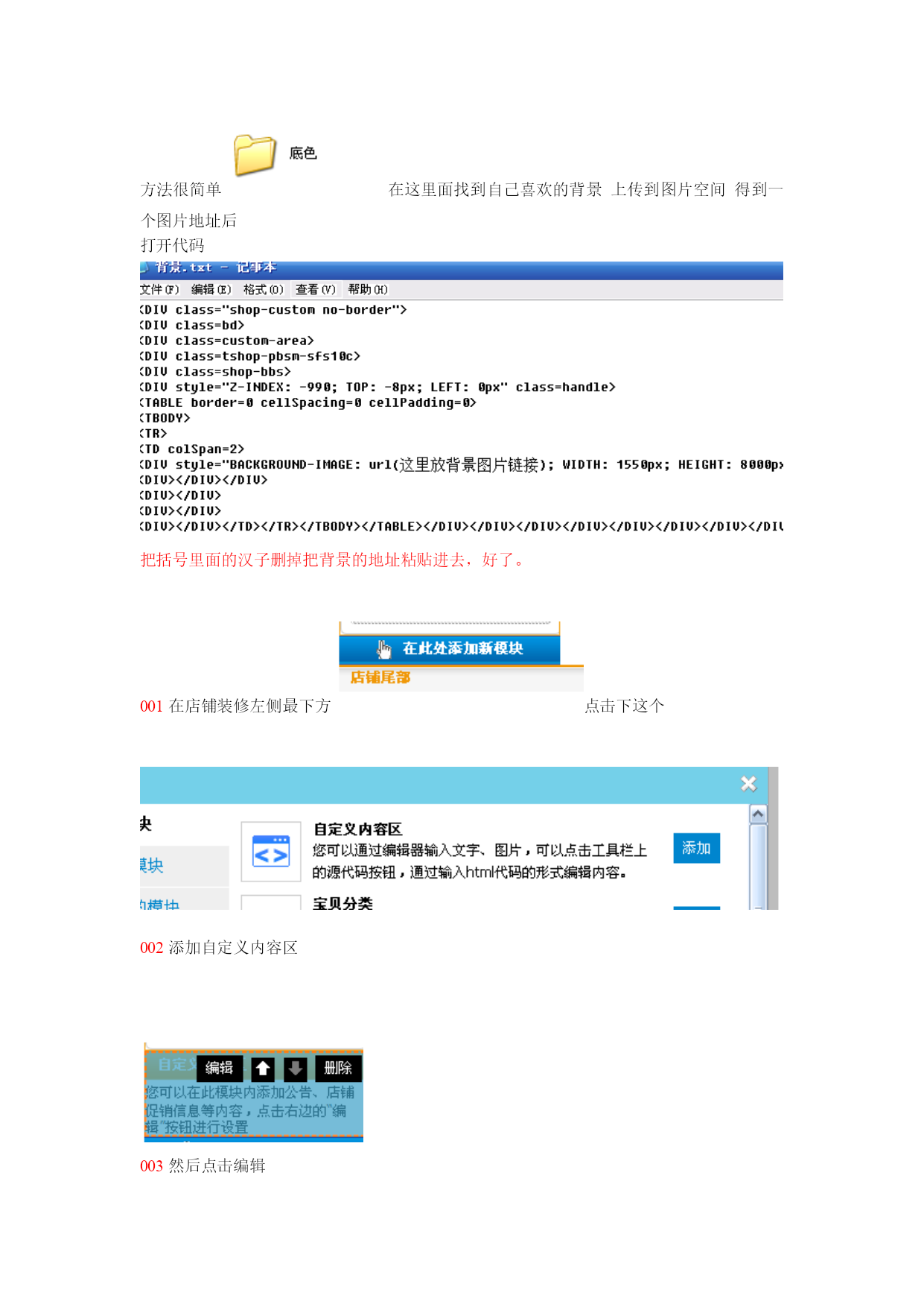 方法很简单在这里面找到自己喜欢的背景上传到图片空间得到一个图片地址后打开代码把括号里面的汉子删掉把背景的地址粘贴进去,好了。001在店铺装修左侧最下方点击下这个002添加自定义内容区003然后点击编辑004点击下编辑源码按钮005代码粘贴进去006然后在点击下这个按钮保存发布即可更多信息HYPERLINK"http://shop104402578.taobao.com/"http://shop104402578.taobao.com/