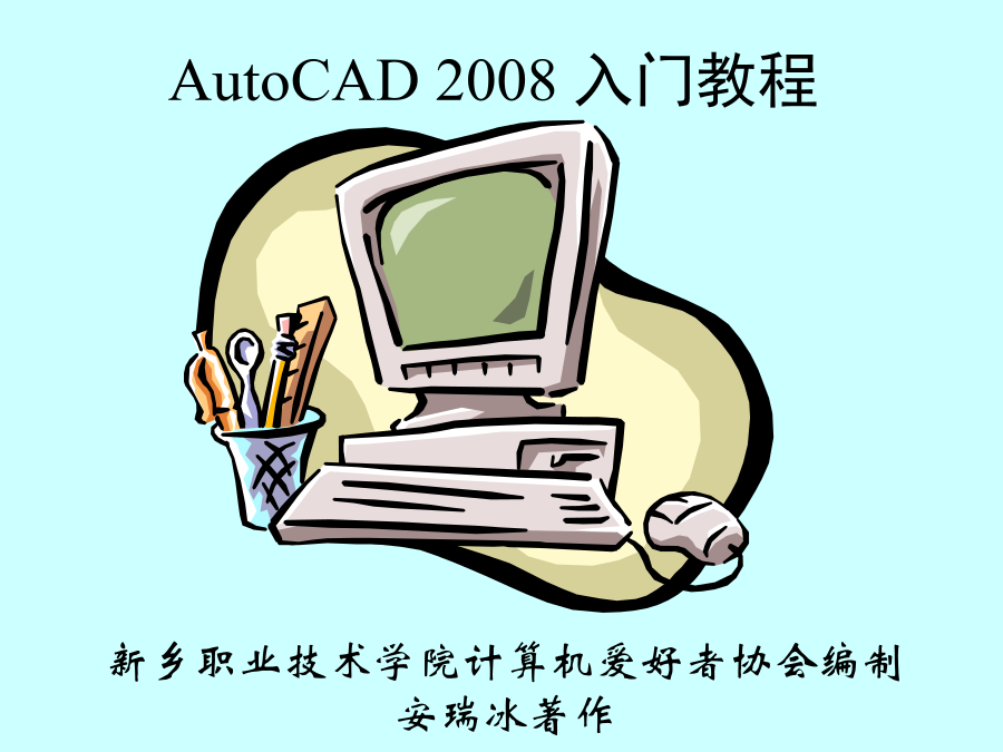 AutoCAD2008入门教程自我介绍绪论建筑平面图图例装配图三维图室外建筑三维效果二维绘图与三维绘图的关系二维CAD系统一般将产品和工程设计图纸看成是“点、线、圆、曲线、文本、…”等几何元素的集合,所依赖是几何模型。三维CAD系统的核心是产品的三维模型。这种三维模型包含了更多的实际结构特征,使用户在采用三维CAD造型工具进行产品结构设计时,更能反映实际产品的构造或加工制造过程。常见三维绘图软件:Pro/E,UG,SolidEdge,Solidworks,CATIA等。如何学习AutoCAD2008:一是
