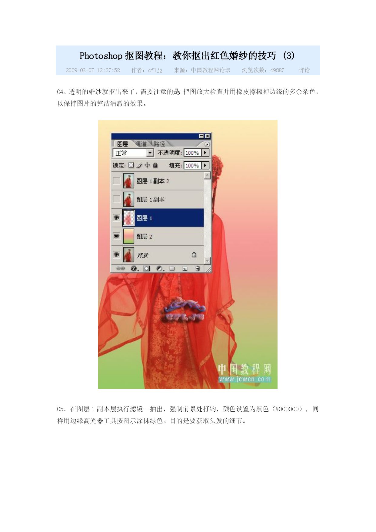 Photoshop抠图教程:教你抠出红色婚纱的技巧(3)2009-03-0712:27:52作者:HYPERLINK"http://www.jcwcn.com/member/member.php?username=cfljg"cfljg来源:HYPERLINK"http://bbs.jcwcn.com"\t"_blank"中国教程网论坛浏览次数:49887HYPERLINK"http://www.jcwcn.com/article/2009/0307/photoshop_31686_3.ht