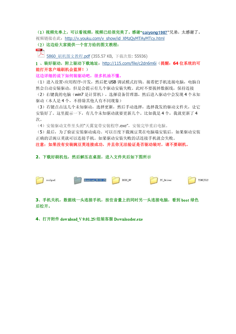 (1)视频先奉上,可以看视频,视频已经很完美了。感谢“caiyong1987”兄弟,太感谢了。视频链接在此:http://v.youku.com/v_show/id_XMzQyMTAyMTcy.html(2)这边给大家提供一个官方给的图文教程:5860_刷机图文教程.pdf(355.57KB,下载次数:55936)1、装好驱动,附上驱动下载地址:http://115.com/file/c2dn6m6i(提醒:64位系统的可能打开客户端刷机会蓝屏!)这边详细的说下如何装驱动吧,很多机油不懂。(1)进入设置-