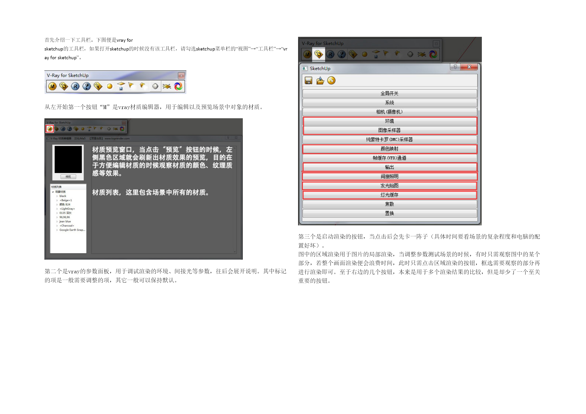 首先介绍一下工具栏。下图便是vrayforsketchup的工具栏,如果打开sketchup的时候没有该工具栏,请勾选sketchup菜单栏的“视图”→“工具栏”→“vrayforsketchup”。从左开始第一个按钮“M”是vray材质编辑器,用于编辑以及预览场景中对象的材质。第二个是vray的参数面板,用于调试渲染的环境、间接光等参数,往后会展开说明。其中标记的项是一般需要调整的项,其它一般可以保持默认。第三个是启动渲染的按钮,当点击后会先卡一阵子(具体时间要看场景的复杂程度和电脑的配置好坏)。图中的