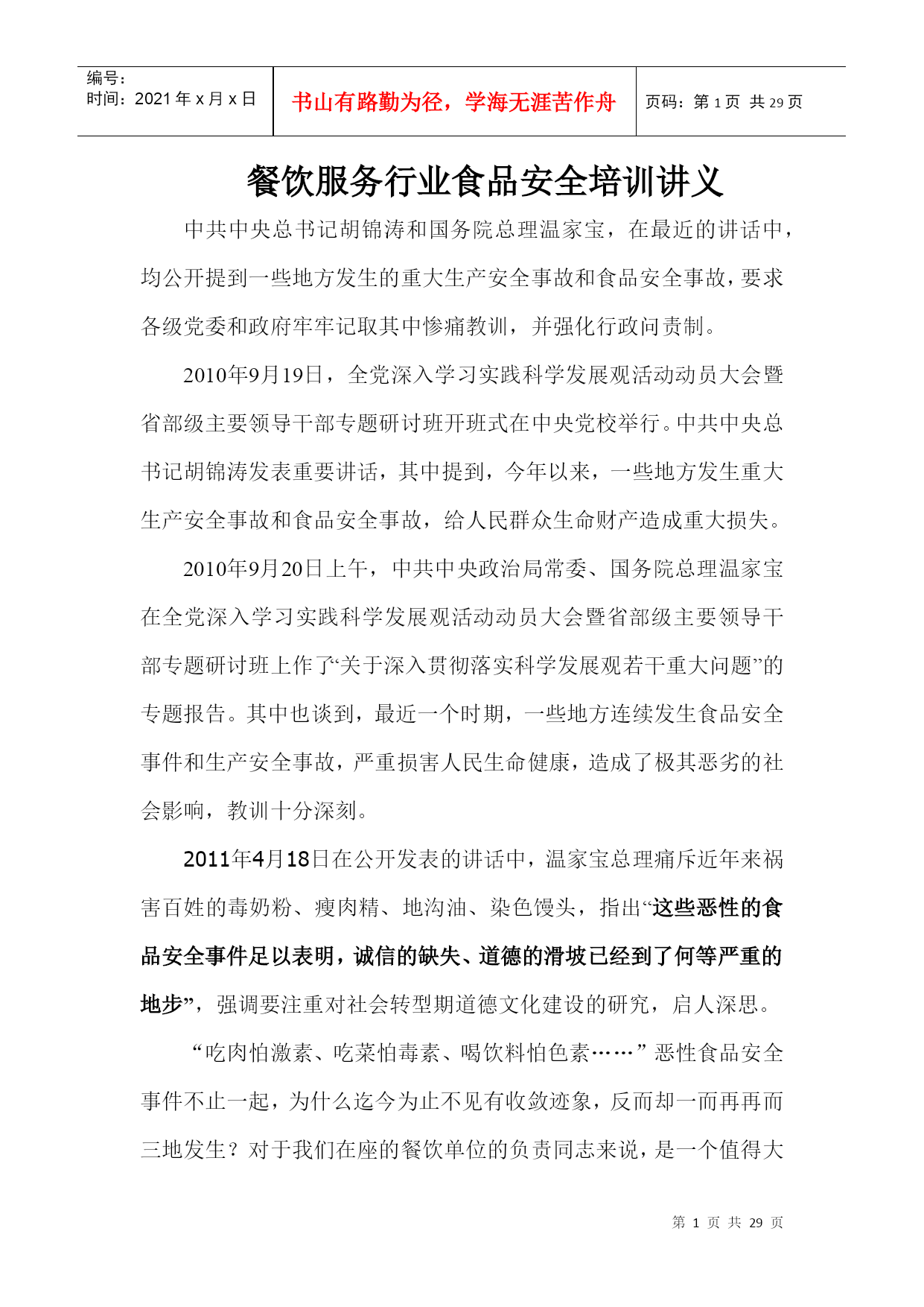 编号:时间:2021年x月x日书山有路勤为径,学海无涯苦作舟页码:第PAGE29页共NUMPAGES29页第PAGE\*MERGEFORMAT29页共NUMPAGES\*MERGEFORMAT29页餐饮服务行业食品安全培训讲义中共中央总书记胡锦涛和国务院总理温家宝,在最近的讲话中,均公开提到一些地方发生的重大生产安全事故和食品安全事故,要求各级党委和政府牢牢记取其中惨痛教训,并强化行政问责制。2010年9月19日,全党深入学习实践科学发展观活动动员大会暨省部级主要领导干部专题研讨班