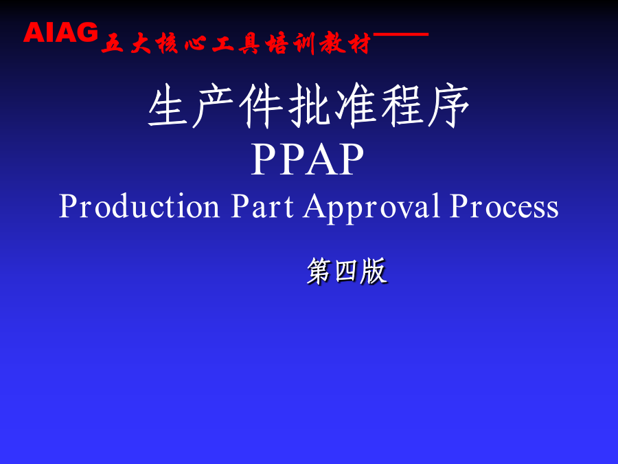 生产件批准程序PPAPProductionPartApprovalProcess1.概述1.概述2.什么是PPAP?2.什么是PPAP?2.什么是PPAP?3(I.2)PPAP要求PPAP要求提交的18项内容3(I.2)PPAP要求I.2PPAP要求提交的18项内容I.2PPAP要求提交的18项内容I.2PPAP要求提交的18项内容I.2PPAP要求提交的18项内容I.2PPAP要求提交的18项内容7控制计划参见AIAG《APQP和控制计划》手册。必须制定,并规定所有的过程控制内容。对于共性零件,可采用相
