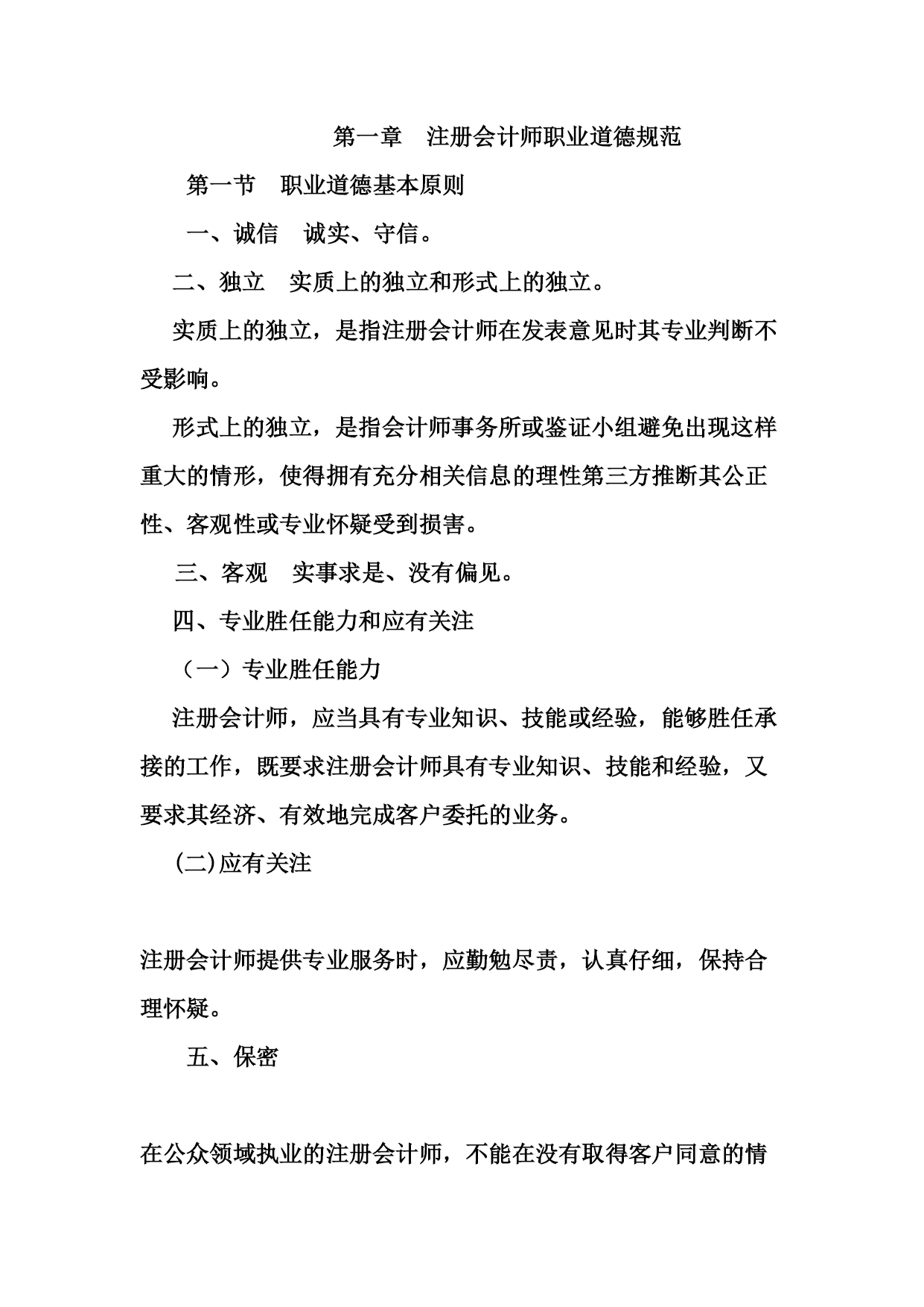 第一章注册会计师职业道德规范第一节职业道德基本原则一、诚信诚实、守信。二、独立实质上的独立和形式上的独立。实质上的独立,是指注册会计师在发表意见时其专业判断不受影响。形式上的独立,是指会计师事务所或鉴证小组避免出现这样重大的情形,使得拥有充分相关信息的理性第三方推断其公正性、客观性或专业怀疑受到损害。三、客观实事求是、没有偏见。四、专业胜任能力和应有关注(一)专业胜任能力注册会计师,应当具有专业知识、技能或经验,能够胜任承接的工作,既要求注册会计师具有专业知识、技能和经验,又要求其经济、有效地完成客户委托