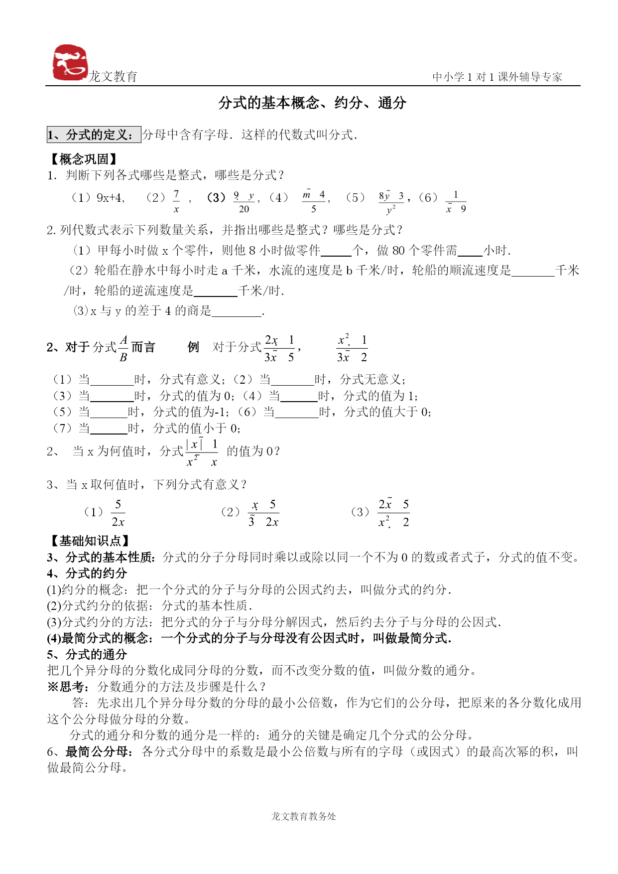 龙文教育中小学1对1课外辅导专家龙文教育教务处分式的基本概念、约分、通分1、分式的定义:分母中含有字母.这样的代数式叫分式.【概念巩固】1.判断下列各式哪些是整式,哪些是分式?(1)9x+4,(2),(3),(4),(5),(6)2.列代数式表示下列数量关系,并指出哪些是整式?哪些是分式?(1)甲每小时做x个零件,则他8小时做零件个,做80个零件需小时.(2)轮船在静水中每小时走a千米,水流的速度是b千米/时,轮船的顺流速度是千米/时,轮船的逆流速度是千米/时.(3)x与y的差于4的商是.2、对于而言例对