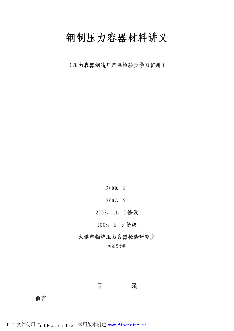 钢制压力容器材料讲义(压力容器制造厂产品检验员学习班用)2000.6.2002.6.2003.11.5修改2005.6.5修改大连市锅炉压力容器检验研究所刘溢恩手稿目录前言PDF文件使用"pdfFactoryPro"试用版本创建www.fineprint.cn第一部分法规、标准对压力容器用钢材料的要求一.压力容器用钢的基本要求二.钢制压力容器允许使用的钢材1.钢板2.钢管3.锻件4.螺栓用钢5.关于焊接材料三.“容规”对材料的要求第二部分材料标准一.代号二.几个机械性能指标及符号三.尺寸、外形、检验与试验