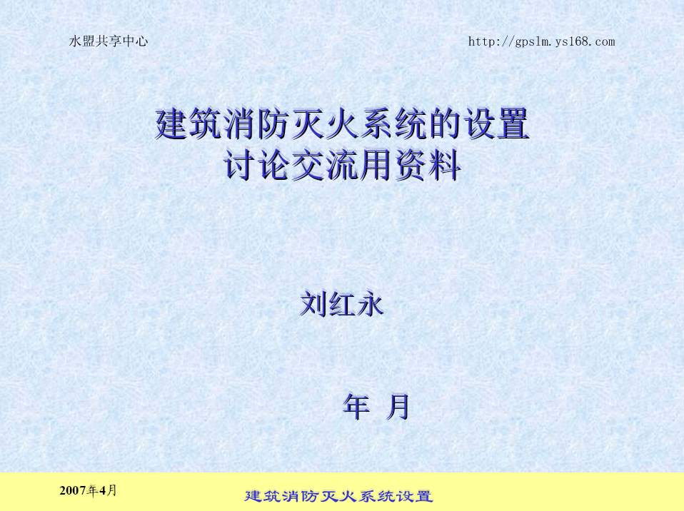 水盟共享中心http://gpslm.ys168.com建筑消防灭火系统的设置建筑消防灭火系统的设置讨论交流用资料讨论交流用资料刘红永刘红永liuhongyong@tom.comliuhongyong@tom.com20072007年年44月月2007年4月建筑消防灭火系统设置水盟共享中心http://gpslm.ys168.com本资料编写目的本资料编写目的1、方便大家阅读建筑灭火系统图纸时查找资料;2、为不熟悉建筑灭火系统人员提供感性认识;3、文中所列全部规范或图集均有电子档备查。2007年4月建筑消