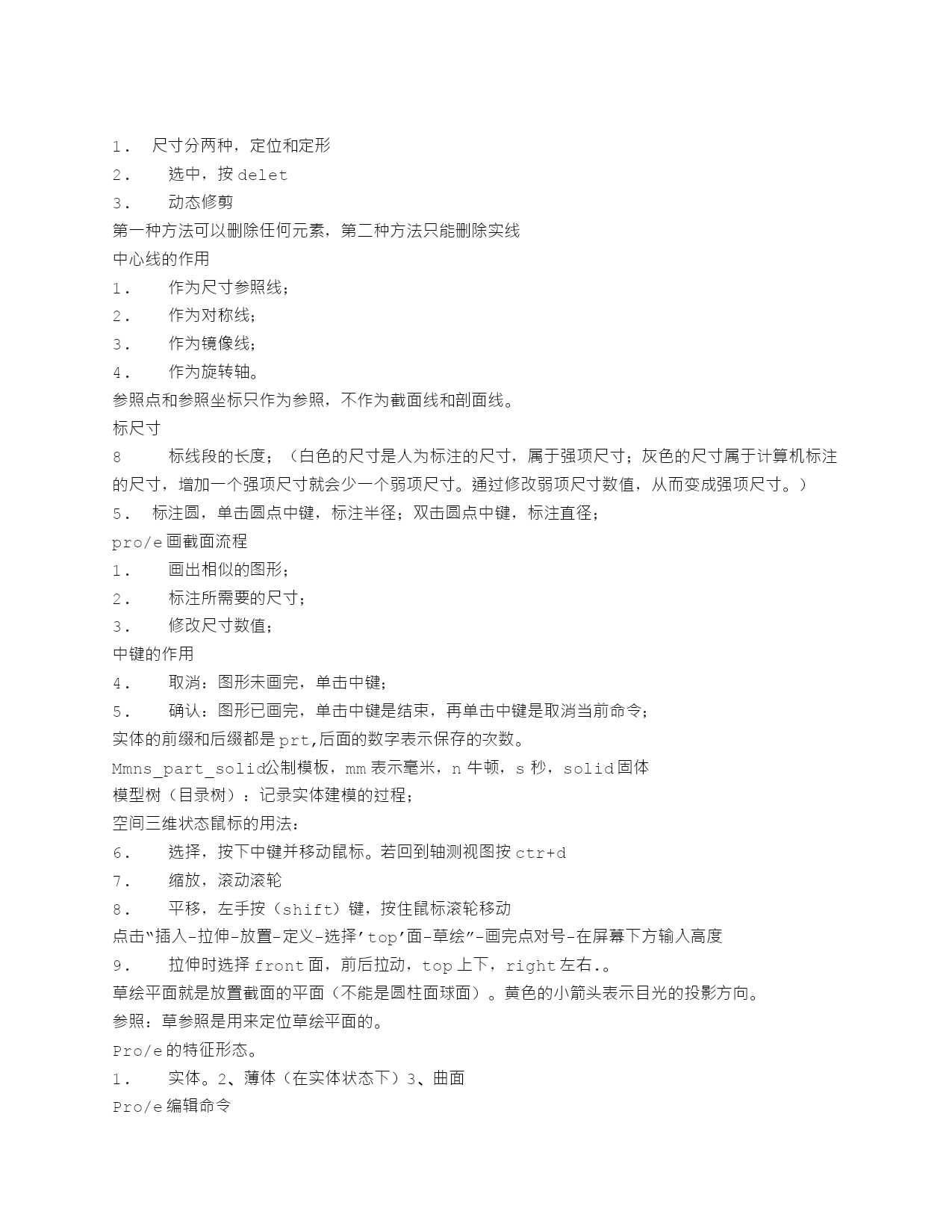 尺寸分两种,定位和定形选中,按delet动态修剪第一种方法可以删除任何元素,第二种方法只能删除实线中心线的作用作为尺寸参照线;作为对称线;作为镜像线;作为旋转轴。参照点和参照坐标只作为参照,不作为截面线和剖面线。标尺寸8标线段的长度;(白色的尺寸是人为标注的尺寸,属于强项尺寸;灰色的尺寸属于计算机标注的尺寸,增加一个强项尺寸就会少一个弱项尺寸。通过修改弱项尺寸数值,从而变成强项尺寸。)标注圆,单击圆点中键,标注半径;双击圆点中键,标注直径;pro/e画截面流程画出相似的图形;标注所需要的尺寸;修改尺寸数值