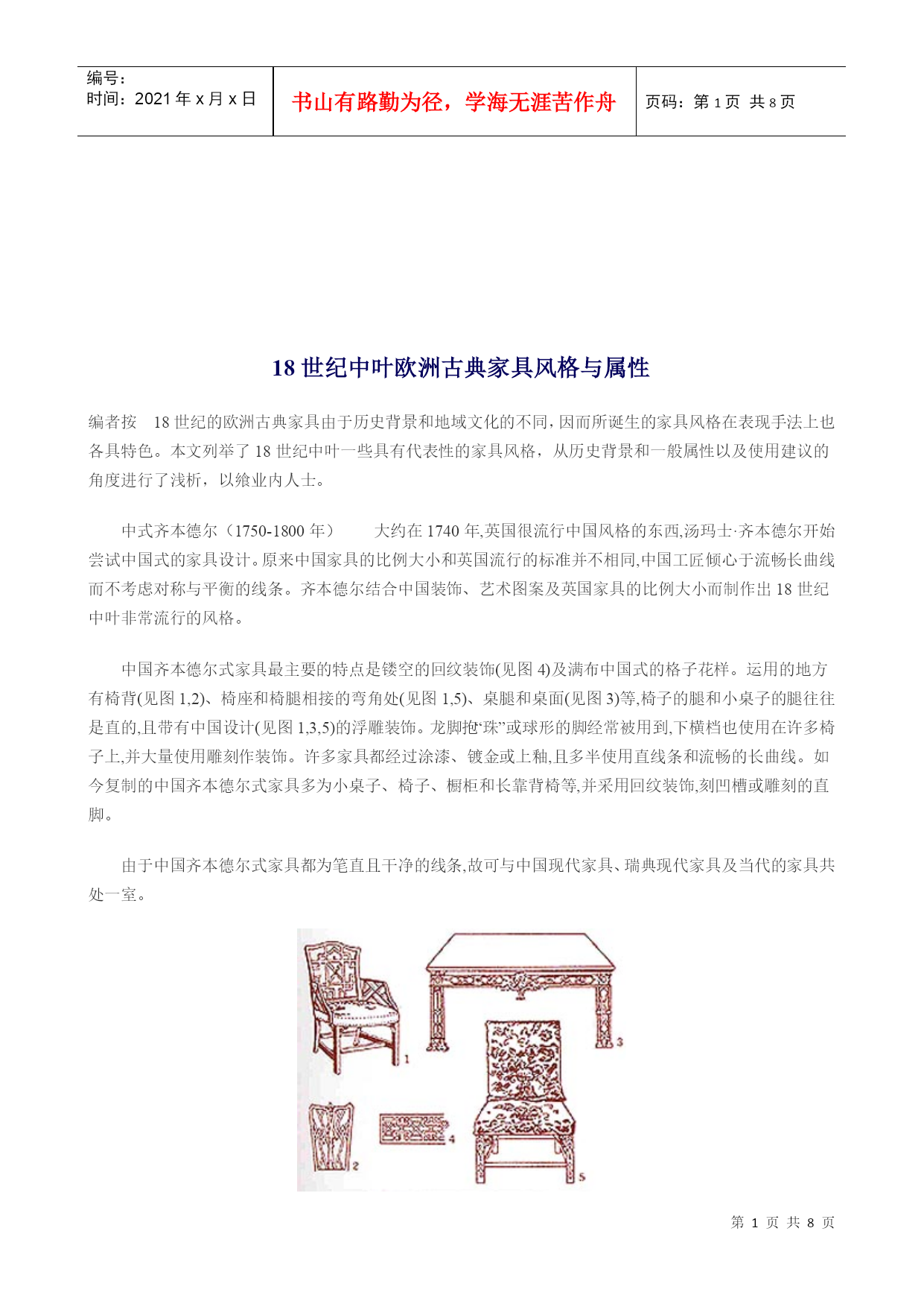 编号:时间:2021年x月x日书山有路勤为径,学海无涯苦作舟页码:第PAGE8页共NUMPAGES8页第PAGE\*MERGEFORMAT8页共NUMPAGES\*MERGEFORMAT8页HYPERLINK""18世纪中叶欧洲古典家具风格与属性编者按18世纪的欧洲古典家具由于历史背景和地域文化的不同,因而所诞生的家具风格在表现手法上也各具特色。本文列举了18世纪中叶一些具有代表性的家具风格,从历史背景和一般属性以及使用建议的角度进行了浅析,以飨业内人士。中式齐本德尔(175