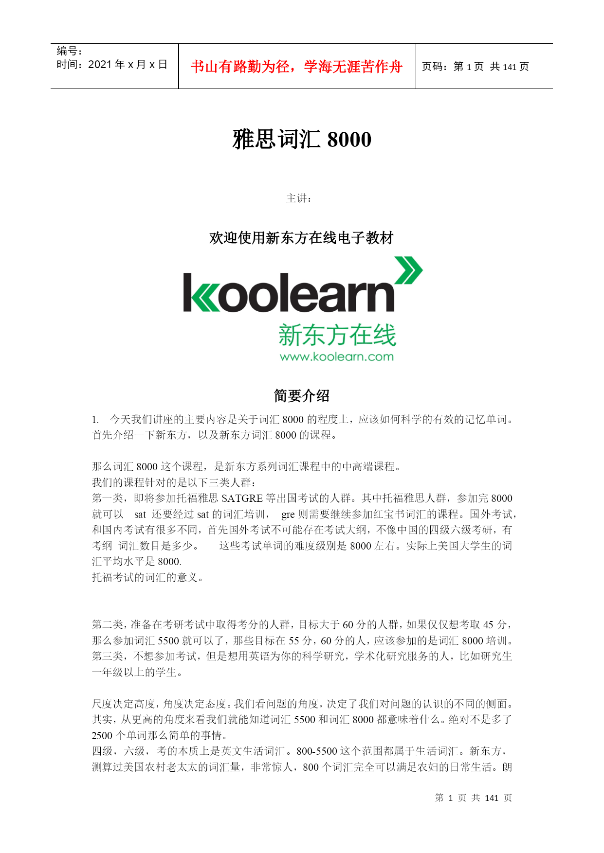 编号:时间:2021年x月x日书山有路勤为径,学海无涯苦作舟页码:第PAGE141页共NUMPAGES141页第PAGE\*MERGEFORMAT141页共NUMPAGES\*MERGEFORMAT141页雅思词汇8000主讲:欢迎使用新东方在线电子教材简要介绍今天我们讲座的主要内容是关于词汇8000的程度上,应该如何科学的有效的记忆单词。首先介绍一下新东方,以及新东方词汇8000的课程。那么词汇8000这个课程,是新东方系列词汇课程中的中高端课程。我们的课程针对的是以下三类人群:
