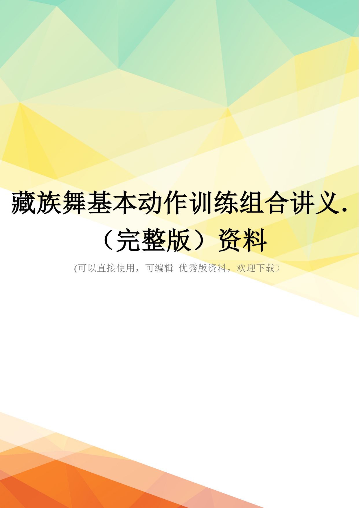 藏族舞基本动作训练组合讲义.(完整版)资料(可以直接使用,可编辑优秀版资料,欢迎下载)第三单元中国民族民间舞项目一藏族民间舞能力教学目标:能够表演藏族风格的儿童舞蹈,运用已掌握的动作素材创编藏族儿童舞蹈及律动舞蹈,具备特教老师应具备的律动舞蹈示范、律动舞蹈创编、律动舞蹈教学能力。知识教学目标:了解藏族民间舞的风格及特点,熟悉藏族民间舞的基本体态与动律,知道常用基本动作名称。任务二基本动作训练组合(一)手臂动作1.双扶胯手自然位,双手腕根扶于胯上,手指自然贴胯,要求“肩坐肘,肘坐腕,腕坐胯”。2.单扶胯手左