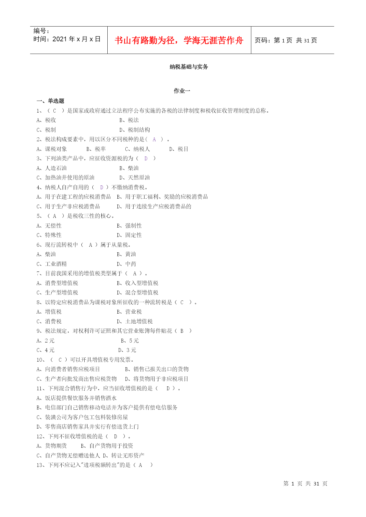 编号:时间:2021年x月x日书山有路勤为径,学海无涯苦作舟页码:第PAGE31页共NUMPAGES31页第PAGE\*MERGEFORMAT31页共NUMPAGES\*MERGEFORMAT31页纳税基础与实务作业一一、单选题1、(C)是国家或政府通过立法程序公布实施的各税的法律制度和税收征收管理制度的总称。A、税收B、税法C、税制D、税制结构2、税法构成要素中,用以区分不同税种的是(A)。A、课税对象B、税率C、纳税人D、税目3、下列油类产品中,应征收资源税的为(D)A、人造石