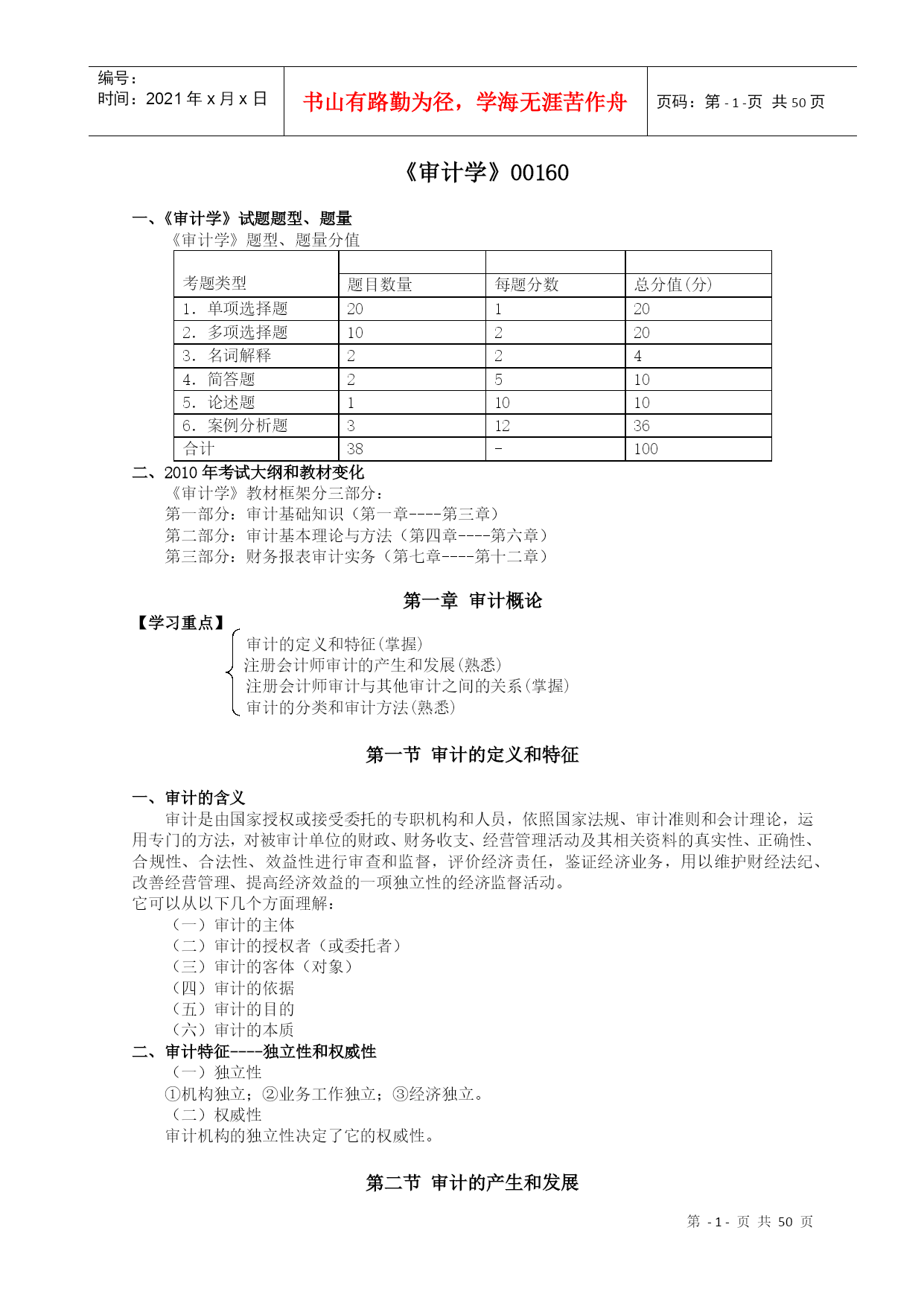 编号:时间:2021年x月x日书山有路勤为径,学海无涯苦作舟页码:第PAGE-50-页共NUMPAGES50页第PAGE\*MERGEFORMAT-50-页共NUMPAGES\*MERGEFORMAT50页《审计学》00160一、《审计学》试题题型、题量《审计学》题型、题量分值考题类型题目数量每题分数总分值(分)1.单项选择题201202.多项选择题102203.名词解释2244.简答题25105.论述题110106.案例分析题31236合计38-100二、2010年考试大纲和教材
