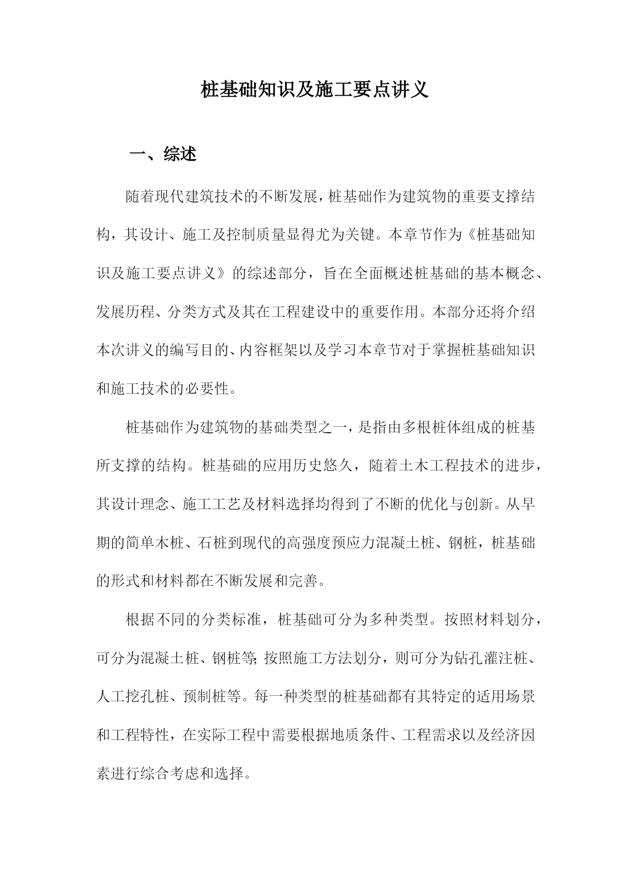 桩基础知识及施工要点讲义一、综述随着现代建筑技术的不断发展,桩基础作为建筑物的重要支撑结构,其设计、施工及控制质量显得尤为关键。本章节作为《桩基础知识及施工要点讲义》的综述部分,旨在全面概述桩基础的基本概念、发展历程、分类方式及其在工程建设中的重要作用。本部分还将介绍本次讲义的编写目的、内容框架以及学习本章节对于掌握桩基础知识和施工技术的必要性。桩基础作为建筑物的基础类型之一,是指由多根桩体组成的桩基所支撑的结构。桩基础的应用历史悠久,随着土木工程技术的进步,其设计理念、施工工艺及材料选择均得到了不断的优