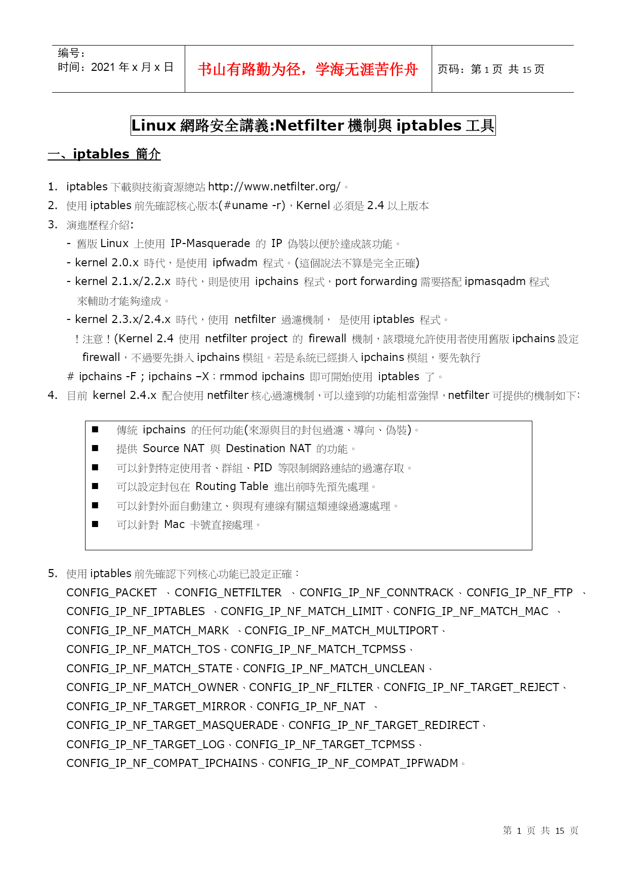 编号:时间:2021年x月x日书山有路勤为径,学海无涯苦作舟页码:第PAGE15页共NUMPAGES15页第PAGE\*MERGEFORMAT15页共NUMPAGES\*MERGEFORMAT15页Linux網路安全講義:Netfilter機制與iptables工具一、iptables簡介iptables下載與技術資源總站http://www.netfilter.org/。使用iptables前先確認核心版本(#uname-r),Kernel必須是2.4以上版本演進歷程介紹:-舊版