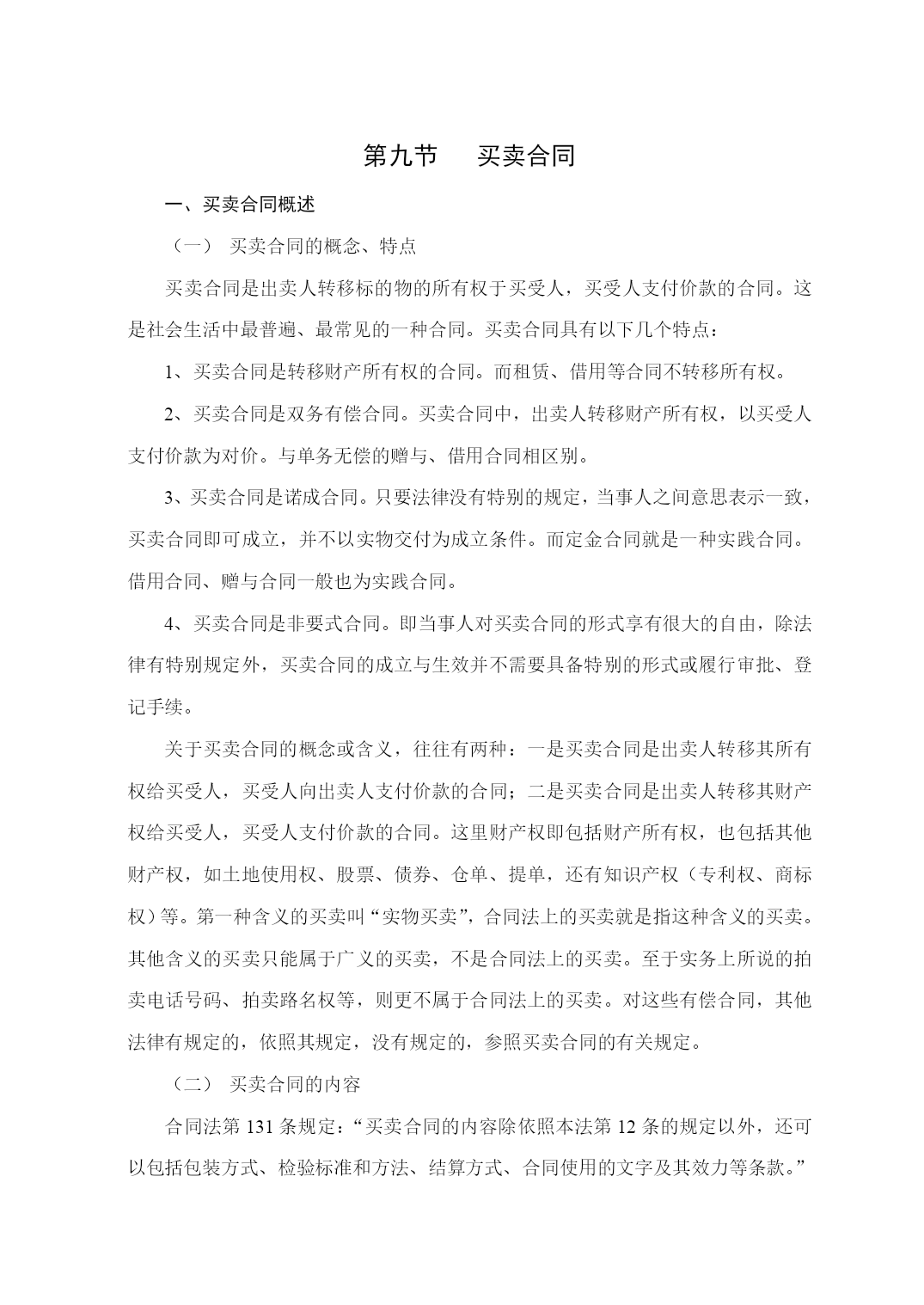 第九节买卖合同一、买卖合同概述买卖合同的概念、特点买卖合同是出卖人转移标的物的所有权于买受人,买受人支付价款的合同。这是社会生活中最普遍、最常见的一种合同。买卖合同具有以下几个特点:1、买卖合同是转移财产所有权的合同。而租赁、借用等合同不转移所有权。2、买卖合同是双务有偿合同。买卖合同中,出卖人转移财产所有权,以买受人支付价款为对价。与单务无偿的赠与、借用合同相区别。3、买卖合同是诺成合同。只要法律没有特别的规定,当事人之间意思表示一致,买卖合同即可成立,并不以实物交付为成立条件。而定金合同就是一种实践合