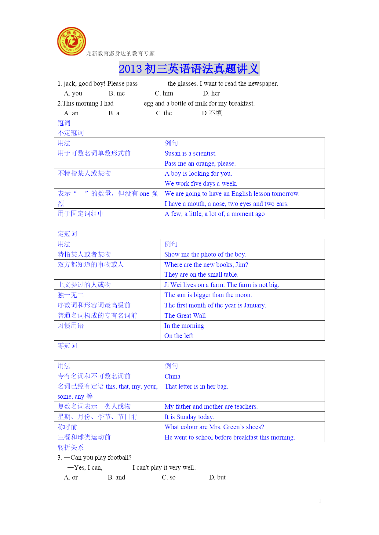 龙新教育您身边的教育专家2013初三英语语法真题讲义1.jack,goodboy!Pleasepass________theglasses.Iwanttoreadthenewspaper.A.youB.meC.himD.her2.ThismorningIhad________eggandabottleofmilkformybreakfast.A.anB.aC.theD.不填冠词不定冠词用法例句用于可数名词单数形式前Susanisascientist.Passmeanorange,please.不特指某人或