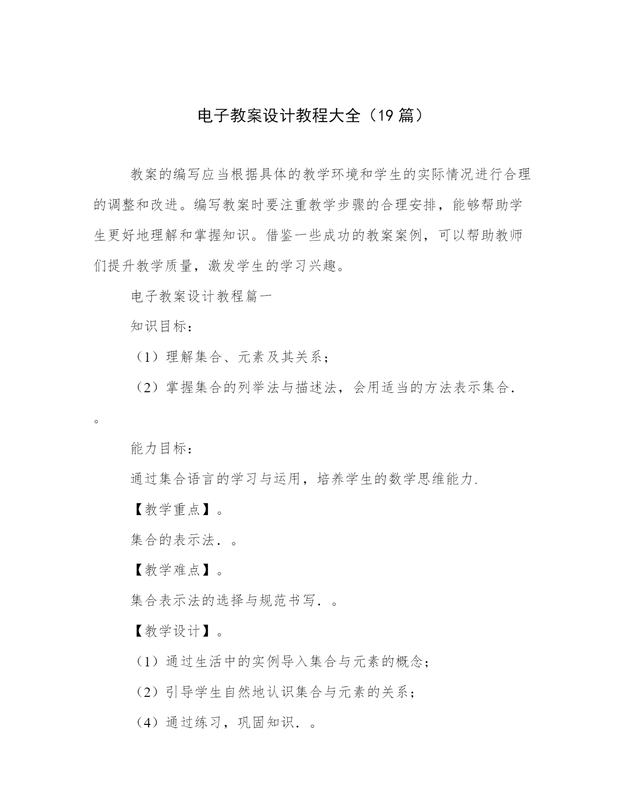 电子教案设计教程大全(19篇)教案的编写应当根据具体的教学环境和学生的实际情况进行合理的调整和改进。编写教案时要注重教学步骤的合理安排,能够帮助学生更好地理解和掌握知识。借鉴一些成功的教案案例,可以帮助教师们提升教学质量,激发学生的学习兴趣。电子教案设计教程篇一知识目标:(1)理解集合、元素及其关系;(2)掌握集合的列举法与描述法,会用适当的方法表示集合.。能力目标:通过集合语言的学习与运用,培养学生的数学思维能力.【教学重点】。集合的表示法.。【教学难点】。集合表示法的选择与规范书写.。【教学设计】。(