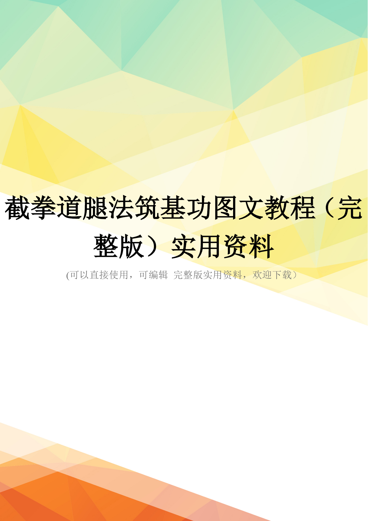 截拳道腿法筑基功图文教程(完整版)实用资料(可以直接使用,可编辑完整版实用资料,欢迎下载)截拳道腿法筑基功图文教程时间:2021-03-2206:27来源:网络作者:转载阅读:2569次腿法作为一种攻击距离长、力量大的技术,在各种武术门派中都占有很高地位,拳谚有云:“手是两扇门,全凭腿打人”、“拳打三分,脚踢七分”,都强调了腿法的重要性。截拳道是一门综合性腿法作为一种攻击距离长、力量大的技术,在各种武术门派中都占有很高地位,拳谚有云:“手是两扇门,全凭腿打人”、“拳打三分,脚踢七分”,都强调了腿法的重要性