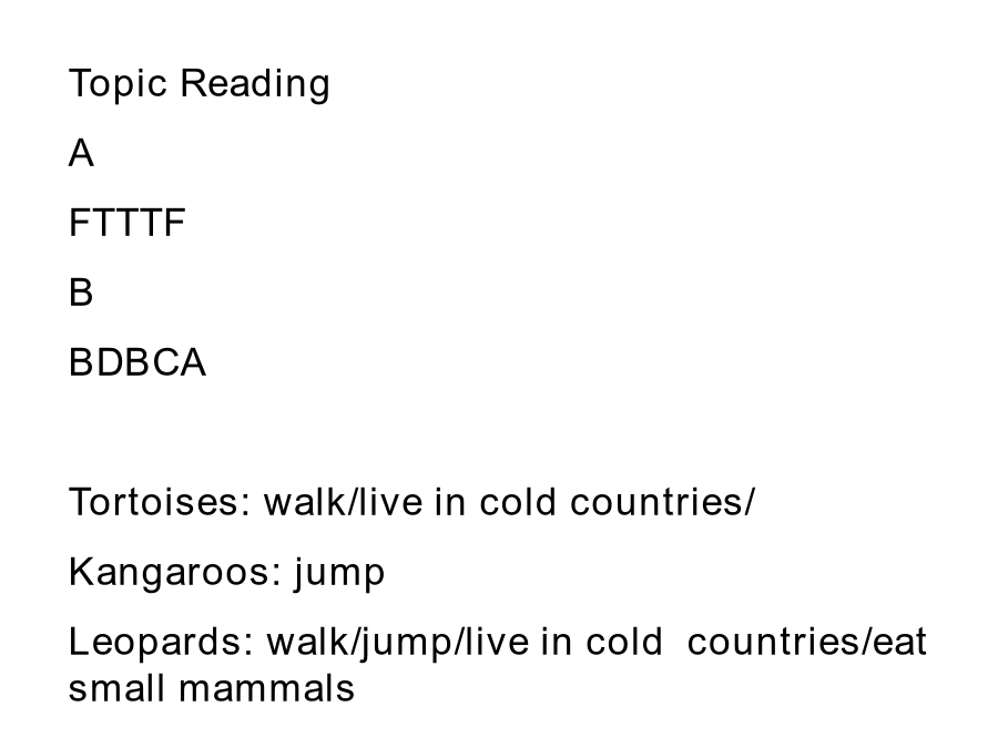 TopicReadingAFTTTFBBDBCATortoises:walk/liveincoldcountries/Kangaroos:jumpLeopards:walk/jump/liveincoldcountries/eatsmallmammalsSelectedReadingThefrogdied.No,shedidn’t.Hesaidthatasaprincess,sheshouldkeepherwordandmakefriendswiththefrog.Yes,shedid.No,shewas