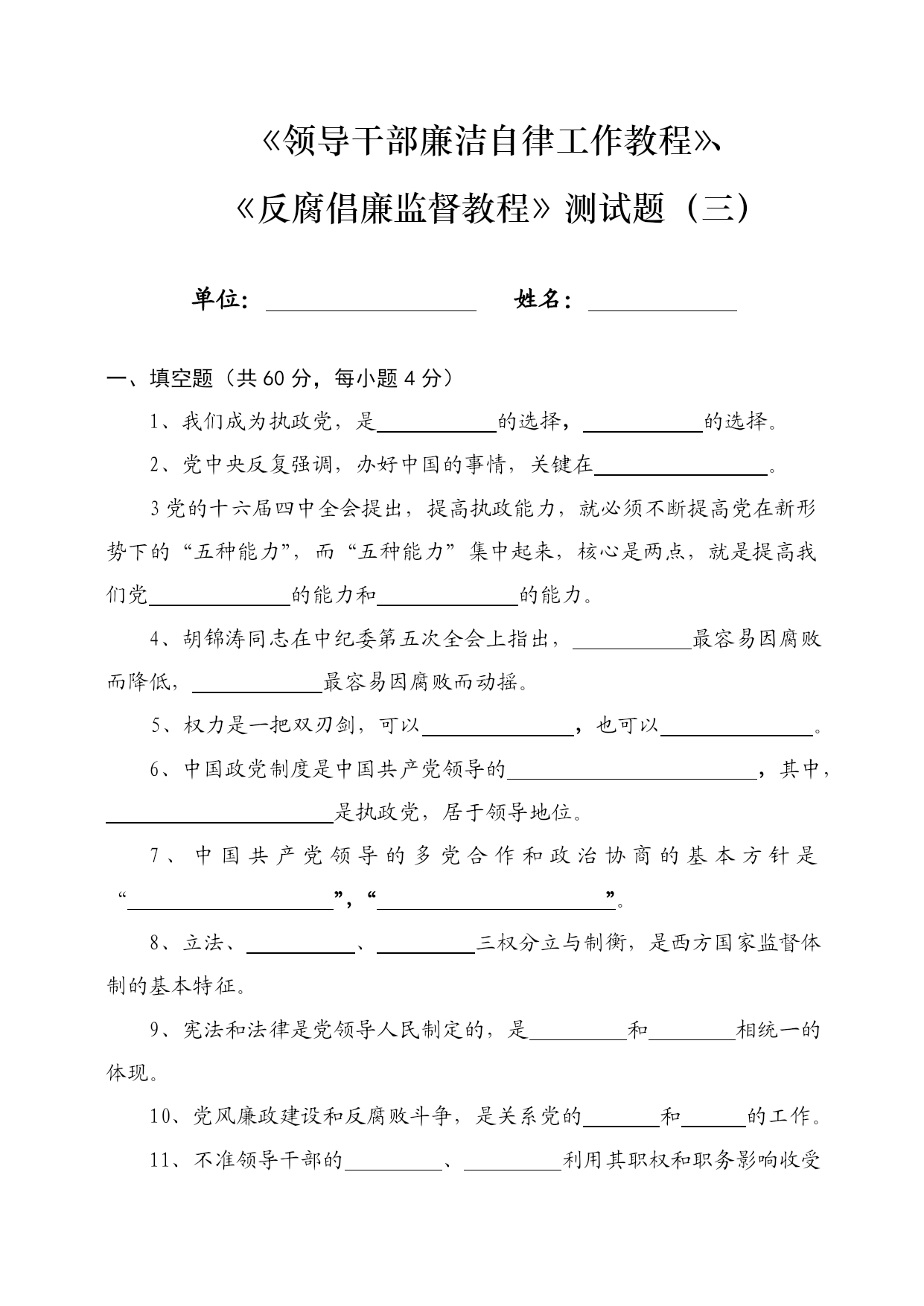 《领导干部廉洁自律工作教程》、《反腐倡廉监督教程》测试题(三)单位:姓名:一、填空题(共60分,每小题4分)1、我们成为执政党,是的选择,的选择。2、党中央反复强调,办好中国的事情,关键在。3党的十六届四中全会提出,提高执政能力,就必须不断提高党在新形势下的“五种能力”,而“五种能力”集中起来,核心是两点,就是提高我们党的能力和的能力。4、胡锦涛同志在中纪委第五次全会上指出,最容易因腐败而降低,最容易因腐败而动摇。5、权力是一把双刃剑,可以,也可以。6、中国政党制度是中国共产党领导的,其中,是执政党,居于