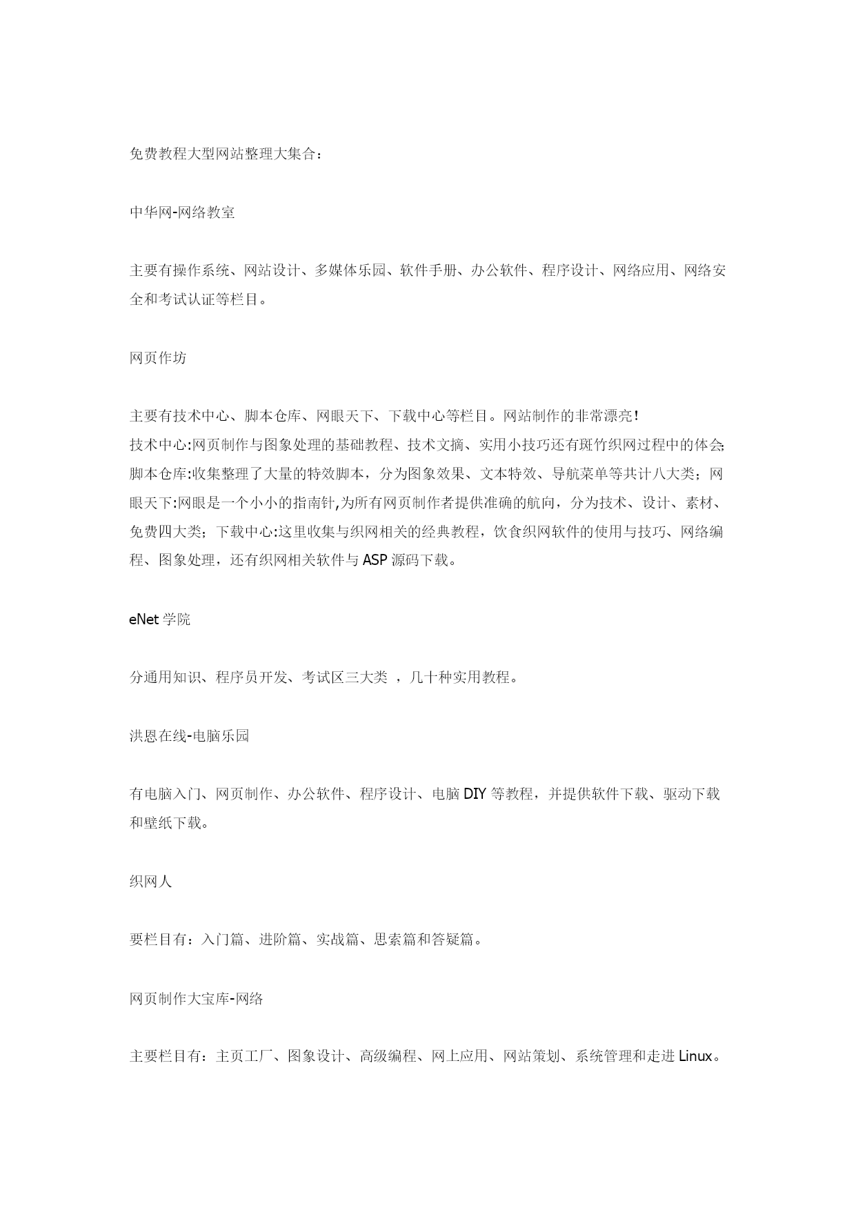免费教程大型网站整理大集合:中华网-网络教室HYPERLINK""\t"_blank"主要有操作系统、网站设计、多媒体乐园、软件手册、办公软件、程序设计、网络应用、网络安全和考试认证等栏目。网页作坊HYPERLINK""\t"_blank"主要有技术中心、脚本仓库、网眼天下、下载中心等栏目。网站制作的非常漂亮!技术中心:网页制作与图象处理的基础教程、技术文摘、实用小技巧还有斑竹织网过程中的体会;脚本仓库:收集整理了大量的特效脚本,分为图象效果、文本特效、导航菜单等共计八大类;网眼天下:网眼是一