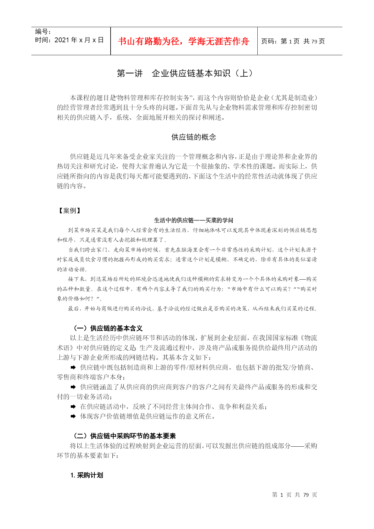 编号:时间:2021年x月x日书山有路勤为径,学海无涯苦作舟页码:第PAGE79页共NUMPAGES79页第PAGE\*MERGEFORMAT79页共NUMPAGES\*MERGEFORMAT79页第一讲企业供应链基本知识(上)本课程的题目是“物料管理和库存控制实务”,而这个内容则恰恰是企业(尤其是制造业)的经营管理者经常遇到且十分头疼的问题。下面首先从与企业物料需求管理和库存控制密切相关的供应链入手,系统、全面地展开相关的探讨和阐述。供应链的概念供应链是近几年来备受企业家关注的一