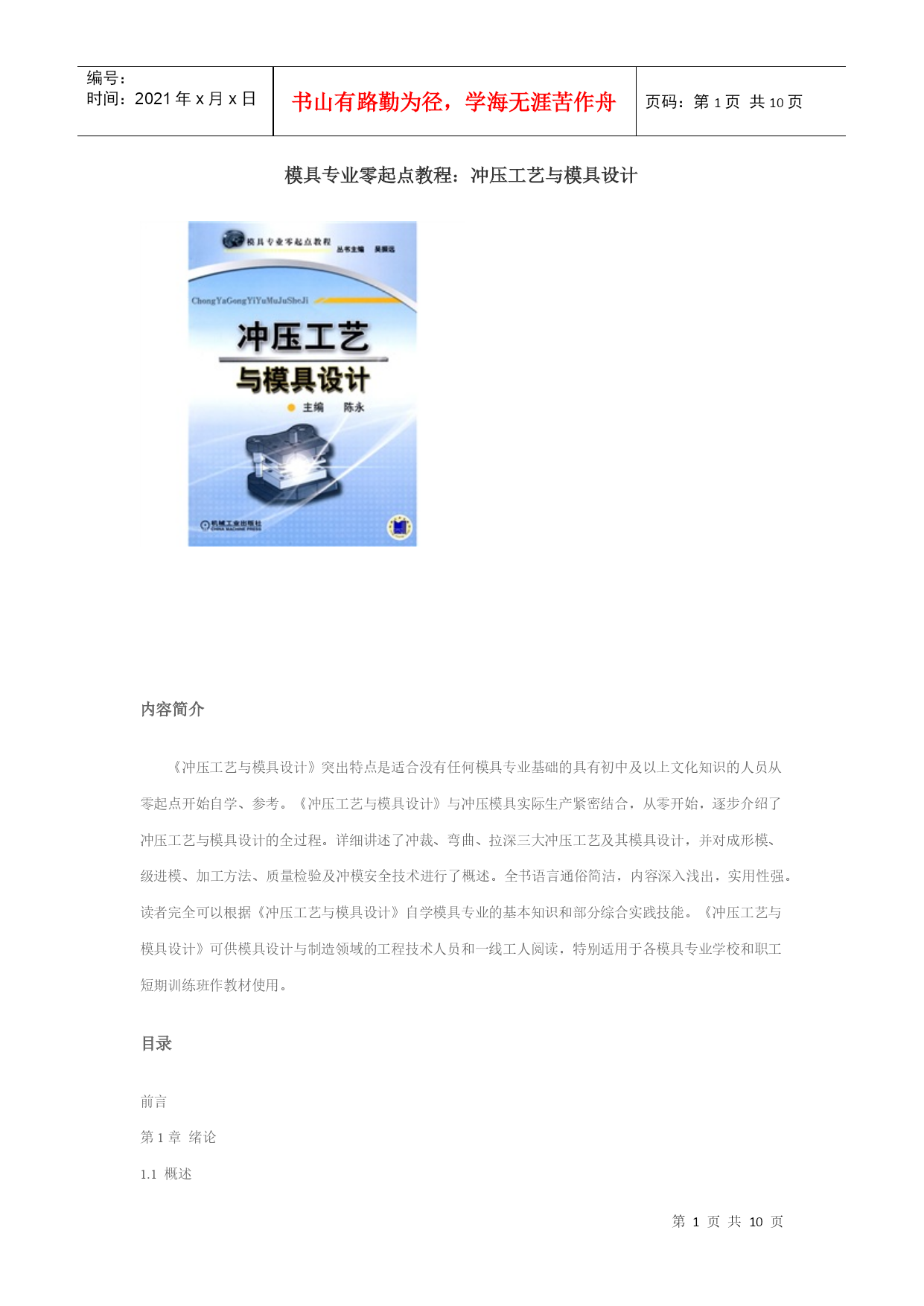 编号:时间:2021年x月x日书山有路勤为径,学海无涯苦作舟页码:第PAGE10页共NUMPAGES10页第PAGE\*MERGEFORMAT10页共NUMPAGES\*MERGEFORMAT10页模具专业零起点教程:冲压工艺与模具设计内容简介《冲压工艺与模具设计》突出特点是适合没有任何模具专业基础的具有初中及以上文化知识的人员从零起点开始自学、参考。《冲压工艺与模具设计》与冲压模具实际生产紧密结合,从零开始,逐步介绍了冲压工艺与模具设计的全过程。详细讲述了冲裁、弯曲、拉深三大冲压