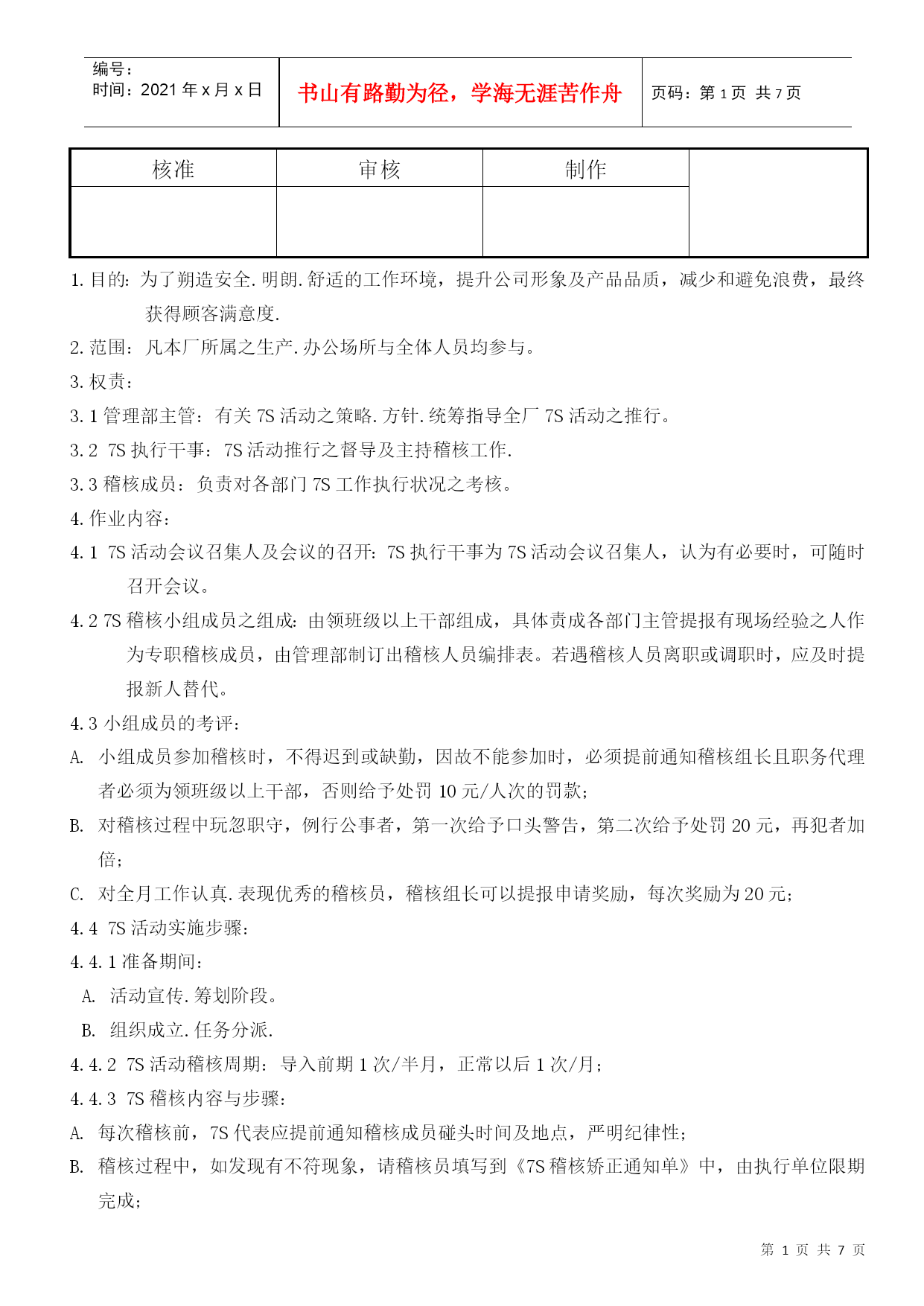 编号:时间:2021年x月x日书山有路勤为径,学海无涯苦作舟页码:第PAGE7页共NUMPAGES7页第PAGE\*MERGEFORMAT7页共NUMPAGES\*MERGEFORMAT7页核准审核制作1.目的:为了朔造安全.明朗.舒适的工作环境,提升公司形象及产品品质,减少和避免浪费,最终获得顾客满意度.2.范围:凡本厂所属之生产.办公场所与全体人员均参与。3.权责:3.1管理部主管:有关7S活动之策略.方针.统筹指导全厂7S活动之推行。3.27S执行干事:7S活动推行之督导及主