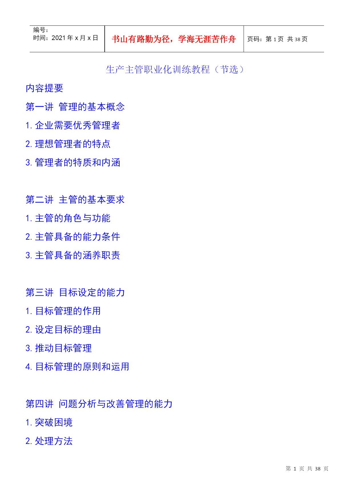 编号:时间:2021年x月x日书山有路勤为径,学海无涯苦作舟页码:第PAGE38页共NUMPAGES38页第PAGE\*MERGEFORMAT38页共NUMPAGES\*MERGEFORMAT38页生产主管职业化训练教程(节选)内容提要第一讲管理的基本概念1.企业需要优秀管理者2.理想管理者的特点3.管理者的特质和内涵第二讲主管的基本要求1.主管的角色与功能2.主管具备的能力条件3.主管具备的涵养职责第三讲目标设定的能力1.目标管理的作用2.设定目标的理由3.推动目标管理4.目标管