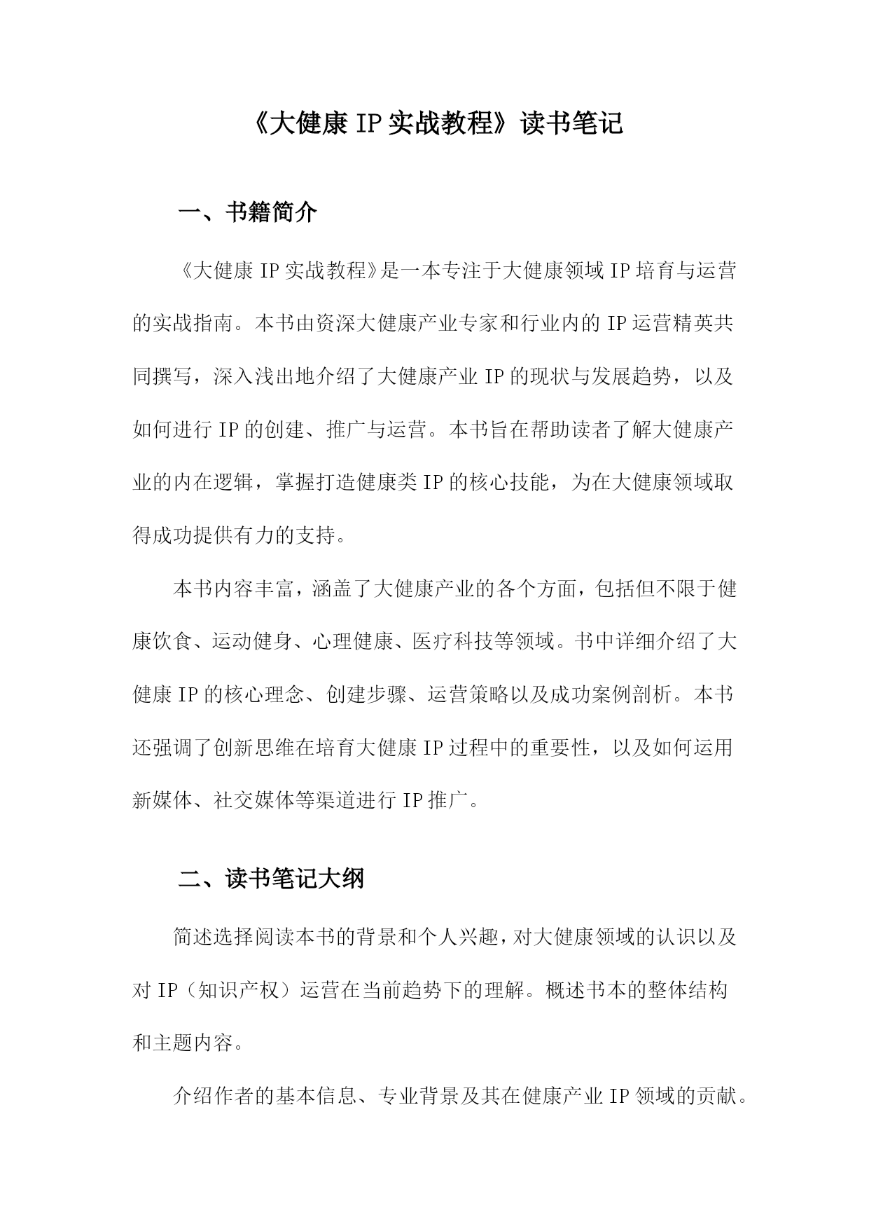 《大健康IP实战教程》读书笔记一、书籍简介《大健康IP实战教程》是一本专注于大健康领域IP培育与运营的实战指南。本书由资深大健康产业专家和行业内的IP运营精英共同撰写,深入浅出地介绍了大健康产业IP的现状与发展趋势,以及如何进行IP的创建、推广与运营。本书旨在帮助读者了解大健康产业的内在逻辑,掌握打造健康类IP的核心技能,为在大健康领域取得成功提供有力的支持。本书内容丰富,涵盖了大健康产业的各个方面,包括但不限于健康饮食、运动健身、心理健康、医疗科技等领域。书中详细介绍了大健康IP的核心理念、创建步骤、运