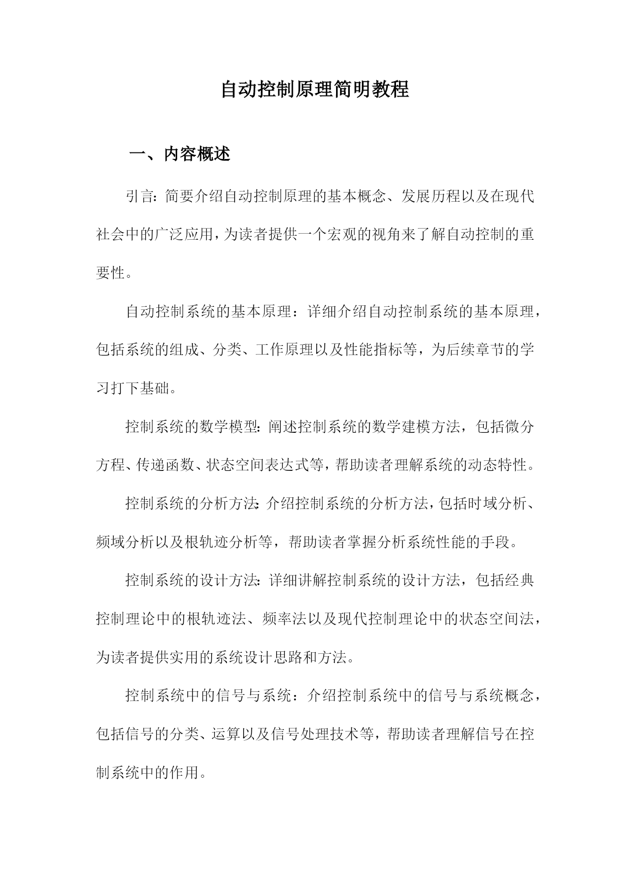 自动控制原理简明教程一、内容概述引言:简要介绍自动控制原理的基本概念、发展历程以及在现代社会中的广泛应用,为读者提供一个宏观的视角来了解自动控制的重要性。自动控制系统的基本原理:详细介绍自动控制系统的基本原理,包括系统的组成、分类、工作原理以及性能指标等,为后续章节的学习打下基础。控制系统的数学模型:阐述控制系统的数学建模方法,包括微分方程、传递函数、状态空间表达式等,帮助读者理解系统的动态特性。控制系统的分析方法:介绍控制系统的分析方法,包括时域分析、频域分析以及根轨迹分析等,帮助读者掌握分析系统性能的