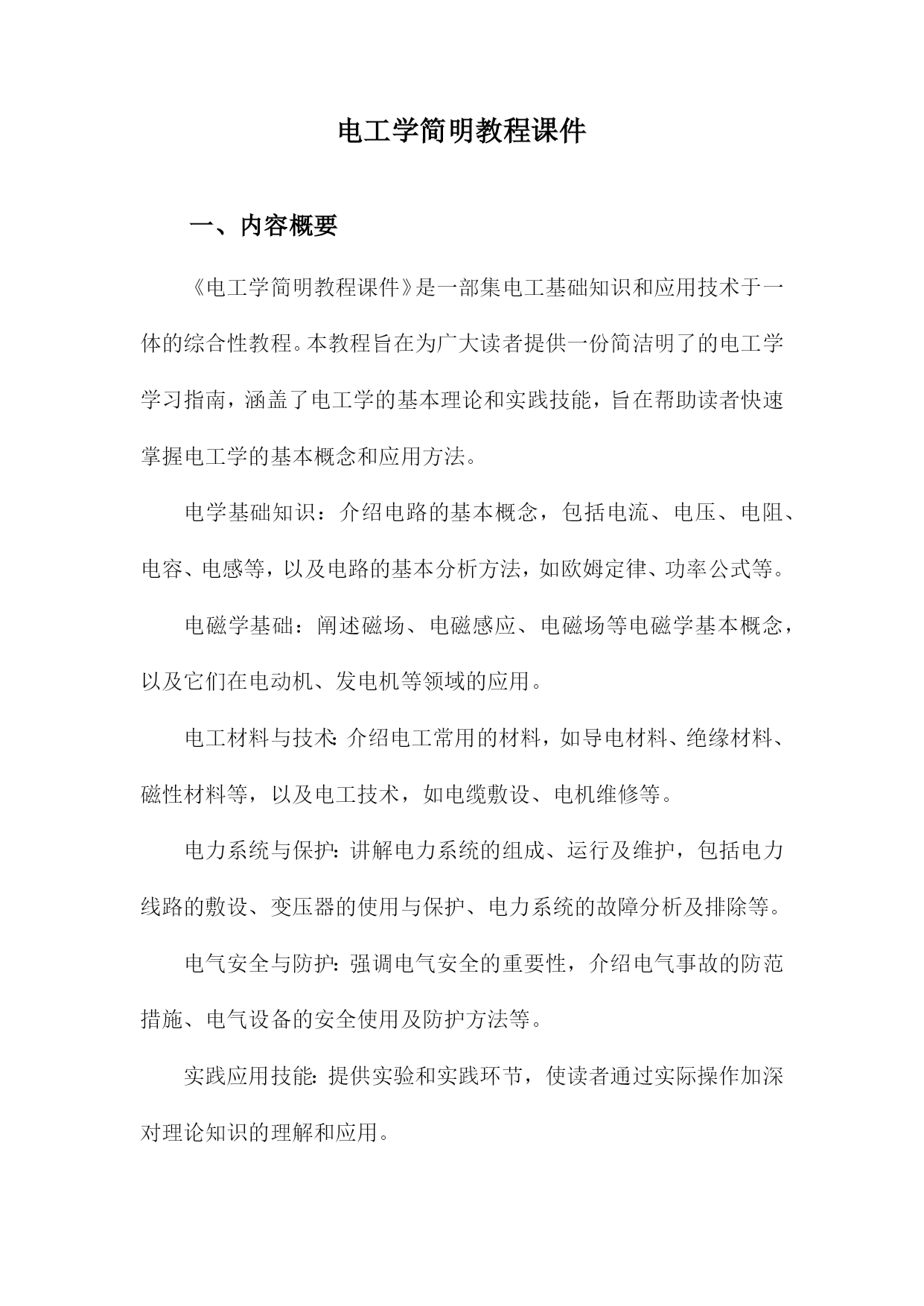电工学简明教程课件一、内容概要《电工学简明教程课件》是一部集电工基础知识和应用技术于一体的综合性教程。本教程旨在为广大读者提供一份简洁明了的电工学学习指南,涵盖了电工学的基本理论和实践技能,旨在帮助读者快速掌握电工学的基本概念和应用方法。电学基础知识:介绍电路的基本概念,包括电流、电压、电阻、电容、电感等,以及电路的基本分析方法,如欧姆定律、功率公式等。电磁学基础:阐述磁场、电磁感应、电磁场等电磁学基本概念,以及它们在电动机、发电机等领域的应用。电工材料与技术:介绍电工常用的材料,如导电材料、绝缘材料、磁