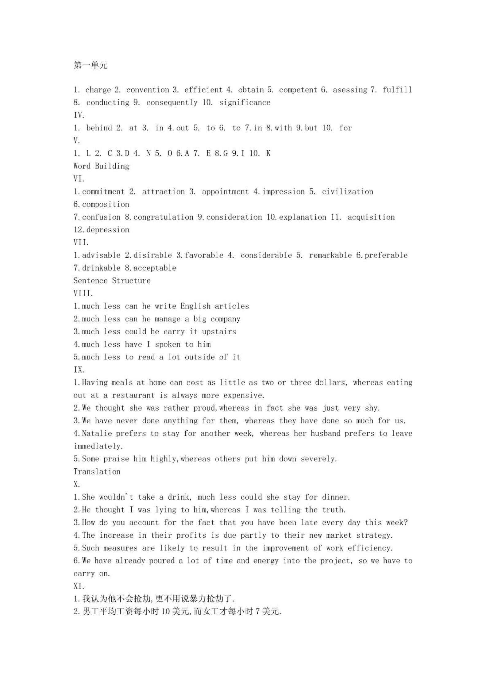 新编大学英语综合教程1答案篇一:新编大学英语综合教程一课后翻译Unit11.3000多辆汽车因刹车征询题昨日被召回(becauseof;recall)1.Morethan3000carswererecalledyesterdaybecauseofabrakeproblem.2.他尽管病得特别重,但仍然来参加会议了。(despite)2.Hecametothemeetingdespitehisseriousillness.3.要确保同样得错误今后不再发生了。(seeitthat)3.Seetoitthatt