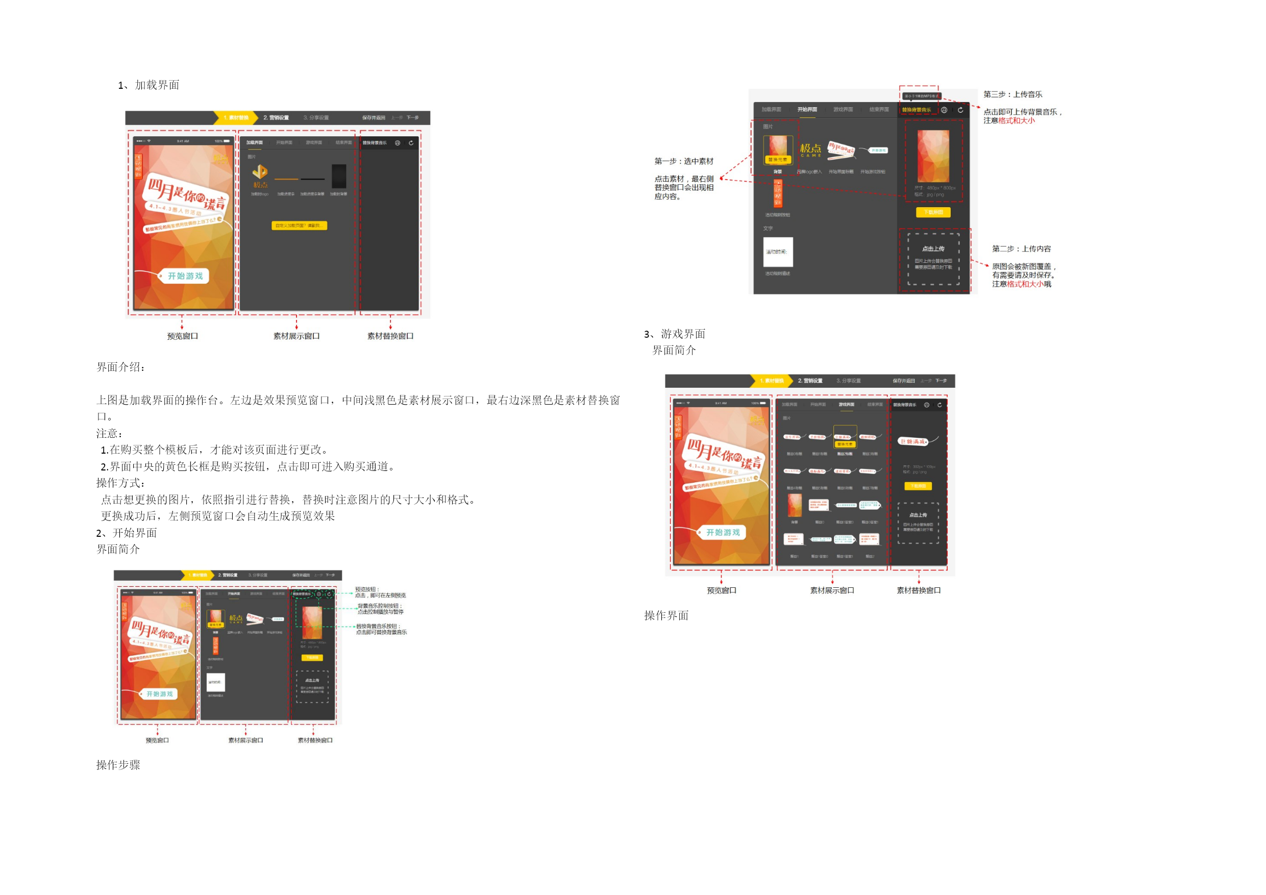 1、加载界面界面介绍:上图是加载界面的操作台。左边是效果预览窗口,中间浅黑色是素材展示窗口,最右边深黑色是素材替换窗口。注意:1.在购买整个模板后,才能对该页面进行更改。2.界面中央的黄色长框是购买按钮,点击即可进入购买通道。操作方式:点击想更换的图片,依照指引进行替换,替换时注意图片的尺寸大小和格式。更换成功后,左侧预览窗口会自动生成预览效果2、开始界面界面简介操作步骤3、游戏界面界面简介操作界面4、结束界面界面简介操作步骤二、营销设置环节(以下五个功能只能五选一)三、分享设置环节走完以上步骤,一个小游