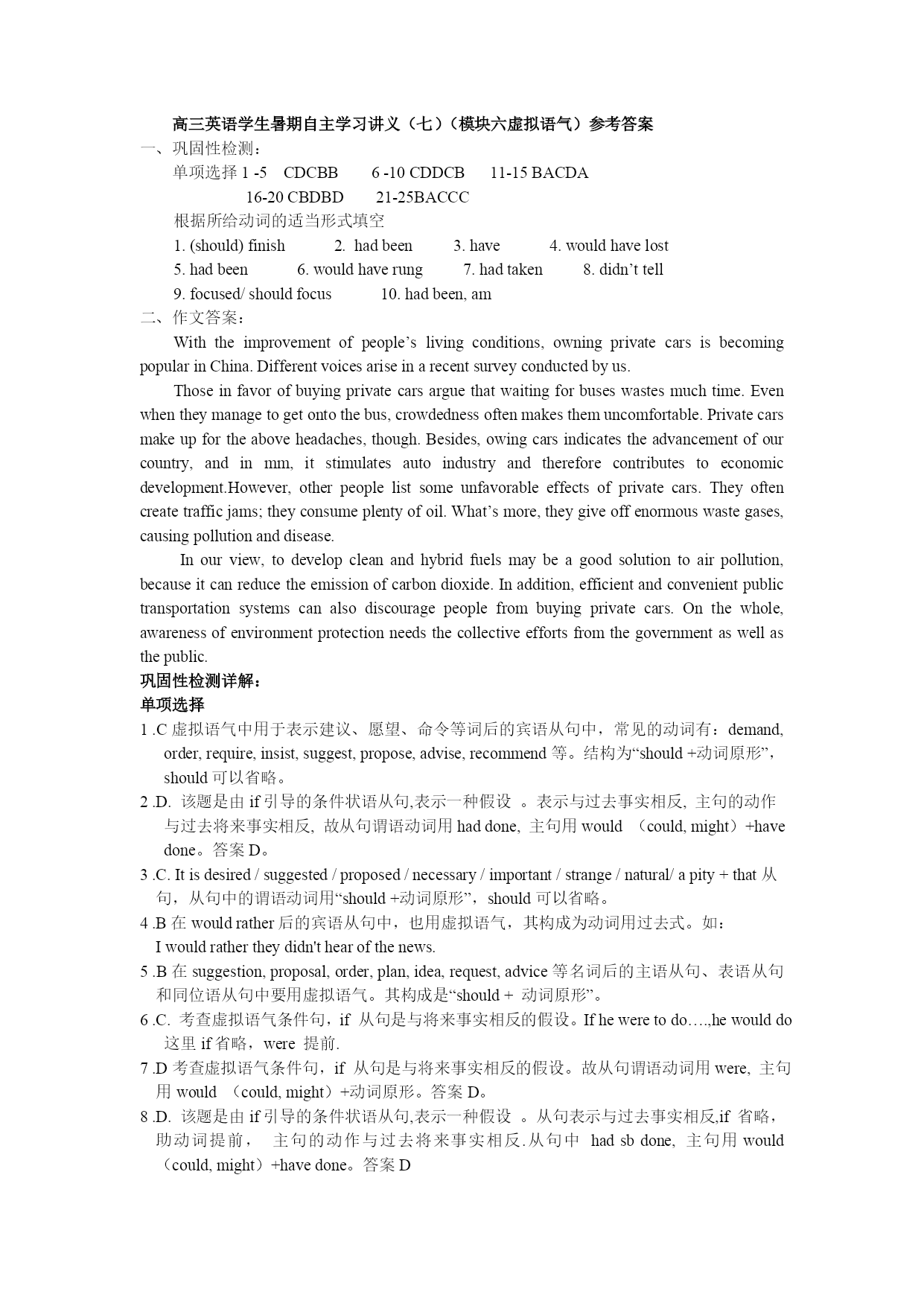 高三英语学生暑期自主学习讲义(七)(模块六虚拟语气)参考答案巩固性检测:单项选择1-5CDCBB6-10CDDCB11-15BACDA16-20CBDBD21-25BACCC根据所给动词的适当形式填空1.(should)finish2.hadbeen3.have4.wouldhavelost5.hadbeen6.wouldhaverung7.hadtaken8.didn’ttell9.focused/shouldfocus10.hadbeen,am二、作文答案:Withtheimprovementofpe