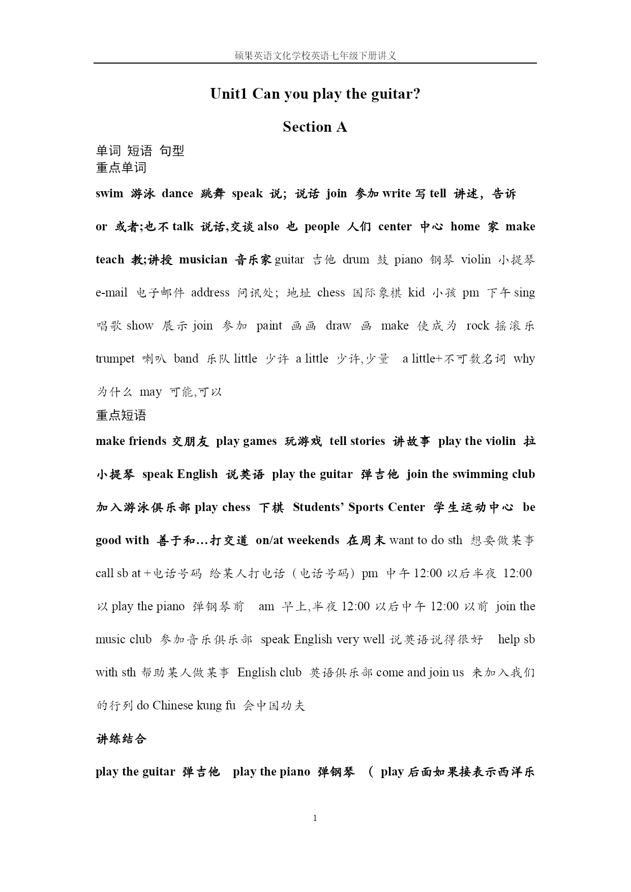 硕果英语文化学校英语七年级下册讲义PAGE\*MERGEFORMAT33Unit1Canyouplaytheguitar?SectionA单词短语句型重点单词swim游泳dance跳舞speak说;说话join参加write写tell讲述,告诉or或者;也不talk说话,交谈also也people人们center中心home家maketeach教;讲授musician音乐家guitar吉他drum鼓piano钢琴violin小提琴e-mail电子邮件address问讯处;地址chess国际象棋kid