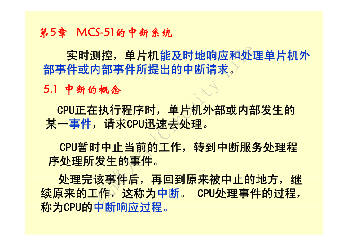 第5章MCS-51的中断系统实时测控,单片机能及时地响应和处理单片机外部事件或内部事件所提出的中断请求。5.1中断的概念CPU正在执行程序时,单片机外部或内部发生的某一事件,请求CPU迅速去处理。CPU暂时中止当前的工作,转到中断服务处理程序处理所发生的事件。处理完该事件后,再回到原来被中止的地方,继续原来的工作,这称为中断。CPU处理事件的过程,称为CPU的中断响应过程线路人生|Circuity。Life图5-1所示。对事件的整个处理过程,称为中断处理(或中断服务)。线路人生|CircuityLife能
