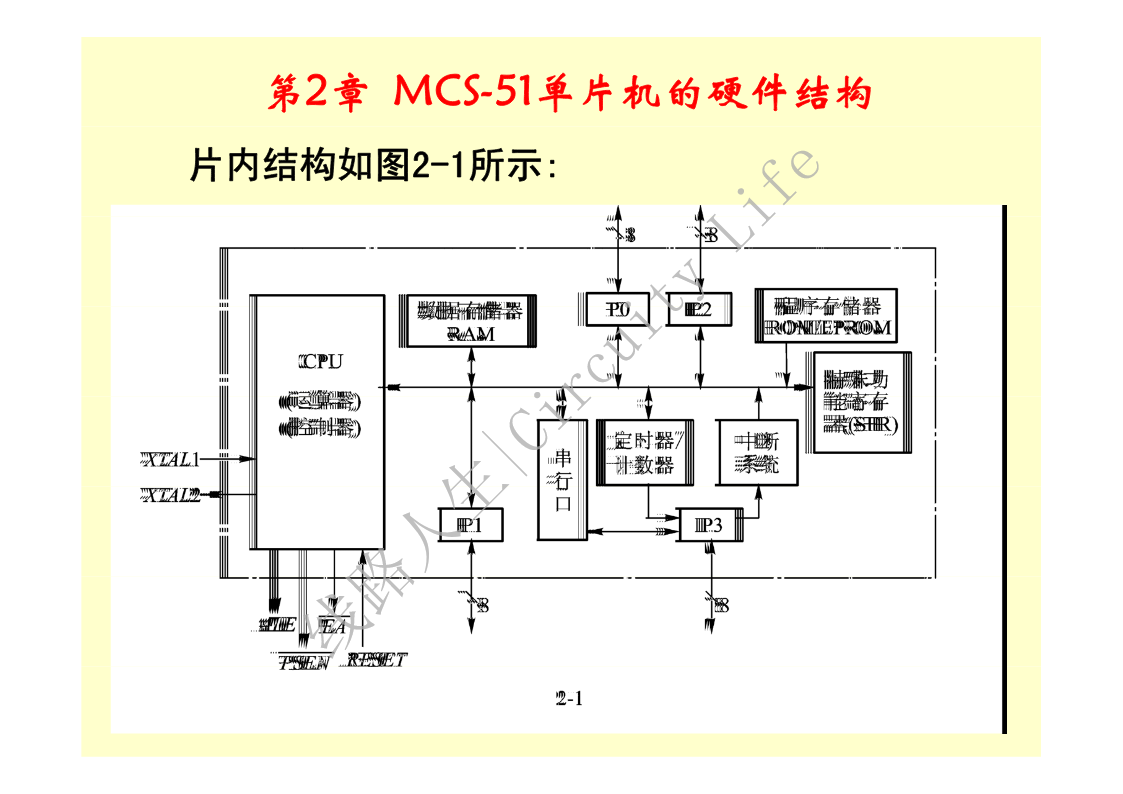 第2章MCS-51单片机的硬件结构片内结构如图2-1所示:线路人生|CircuityLife介绍图2-1中的各功能部件:1.CPU(微处理器)2.数据存储器(RAM)片内为128个字节(52子系列的为256个字节)3.程序存储器(ROM/EPROM)8031:无此部件;8051:4K字节ROM;8751:4K字节EPROM;89C51/89C52/89C55:4K/8K/20K字节闪存。4.中断系统线路人生|CircuityLife5.定时器/计数器6.串行口1个全双工的异步串行口,具有四种工作方式。7.