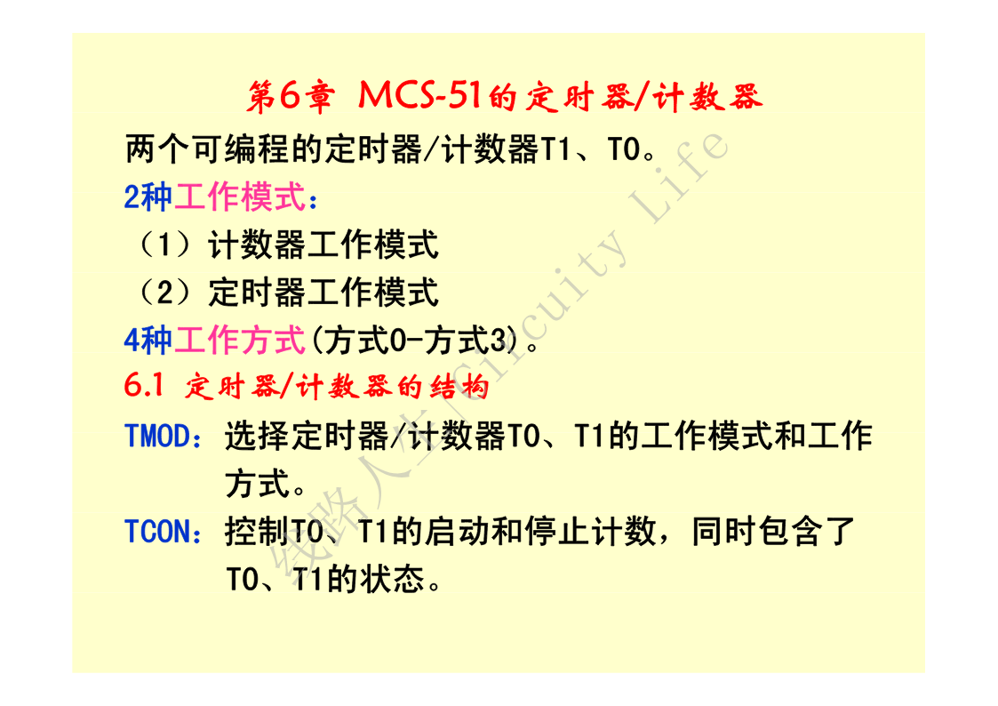 第6章MCS-51的定时器/计数器两个可编程的定时器/计数器T1、T0。2种工作模式:(1)计数器工作模式(2)定时器工作模式4种工作方式(方式0-方式3)。6.1定时器/计数器的结构TMOD:选择定时器/计数器T0、T1的工作模式和工作方式。TCON:控制T0、T1的启动和停止计数,同时包含了T0、T1线路人生|Circuity的状态。Life单片机复位时,两个寄存器的所有位都被清0。6.1.1工作方式控制寄存器TMOD线路人生|CircuityLife8位分为两组,高4位控制T1,低4位控制T0。(1