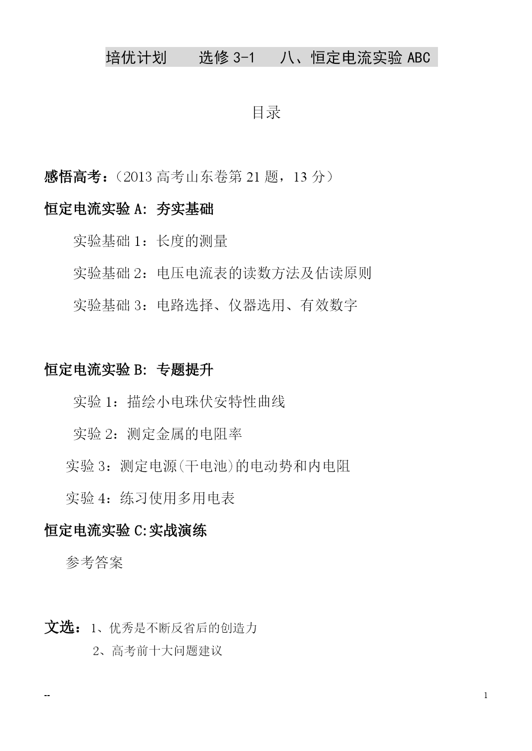 --培优计划选修3-1八、恒定电流实验ABC目录感悟高考:(2013高考山东卷第21题,13分)恒定电流实验A:夯实基础实验基础1:长度的测量实验基础2:电压电流表的读数方法及估读原则实验基础3:电路选择、仪器选用、有效数字恒定电流实验B:专题提升实验1:描绘小电珠伏安特性曲线实验2:测定金属的电阻率实验3:测定电源(干电池)的电动势和内电阻实验4:练习使用多用电表恒定电流实验C:实战演练参考答案文选:1、优秀是不断反省后的创造力2、高考前十大问题建议例题:(2013高考山东卷第21题,13分)01234