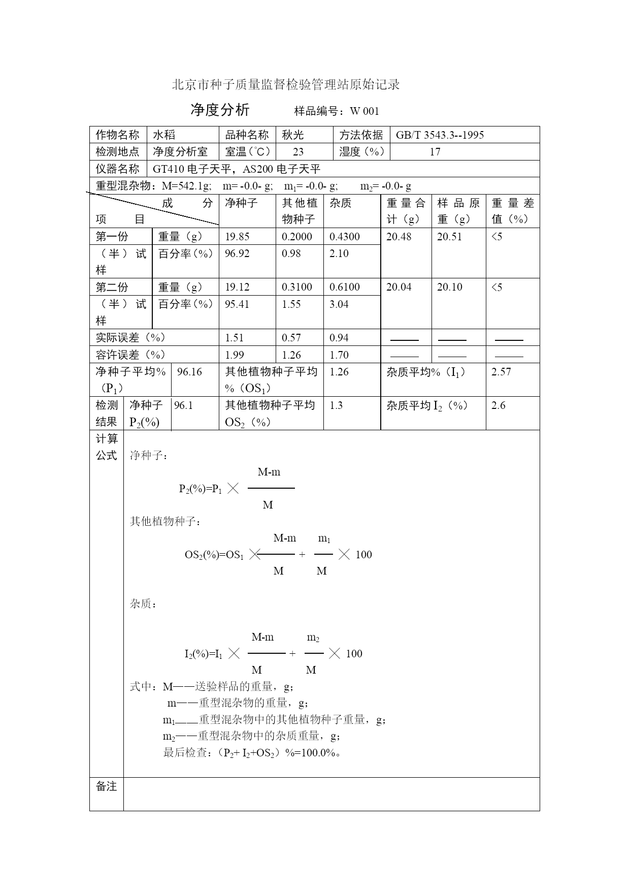 北京市种子质量监督检验管理站原始记录净度分析样品编号:W001作物名称水稻品种名称秋光方法依据GB/T3543.3--1995检测地点净度分析室室温(℃)23湿度(%)17仪器名称GT410电子天平,AS200电子天平重型混杂物:M=542.1g;m=-0.0-g;m1=-0.0-g;m2=-0.0-g成分项目净种子其他植物种子杂质重量合计(g)样品原重(g)重量差值(%)第一份重量(g)19.850.20000.430020.4820.51<5(半)试样百分率(%)96.920.982.10第二份重量(