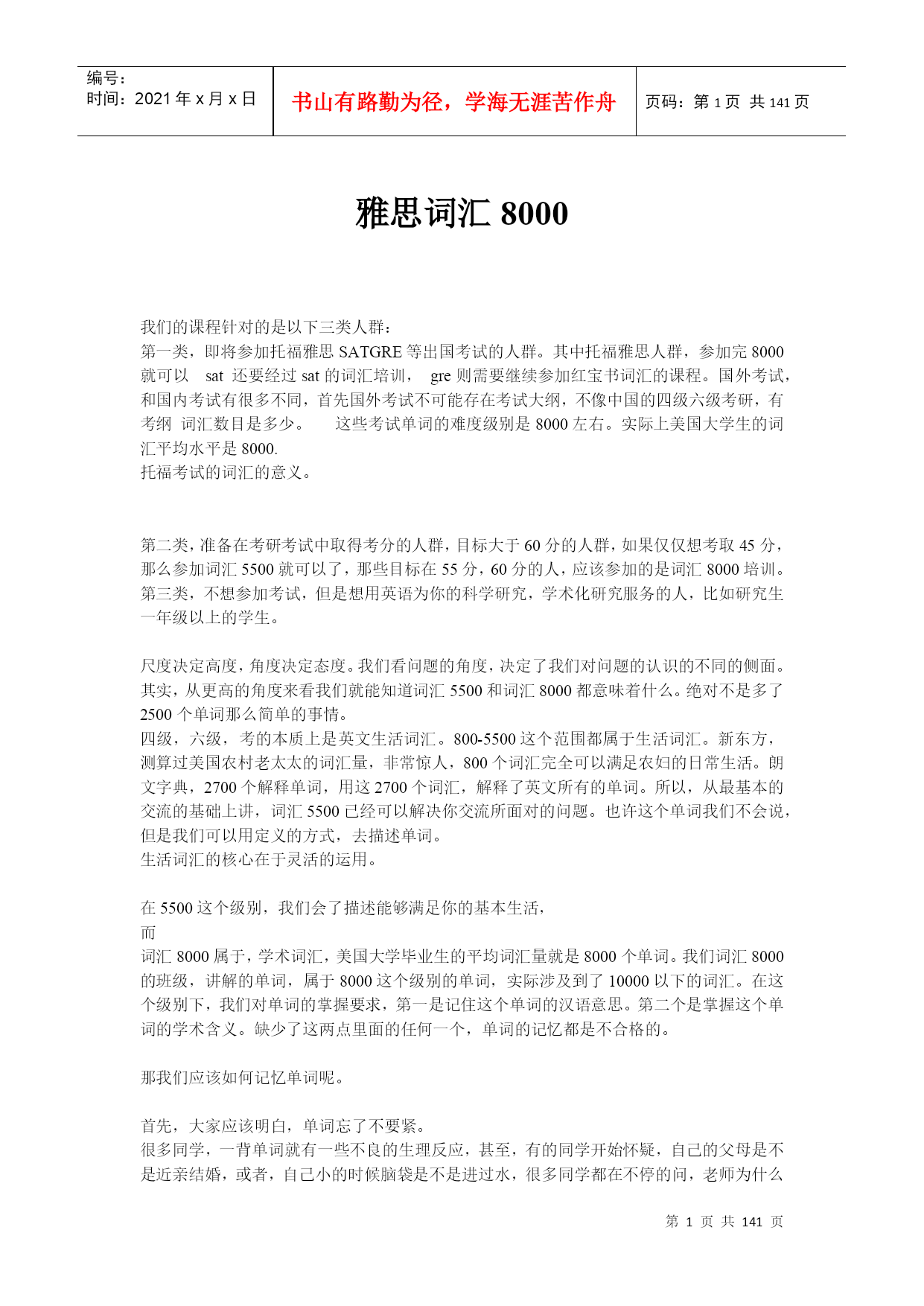 编号:时间:2021年x月x日书山有路勤为径,学海无涯苦作舟页码:第PAGE141页共NUMPAGES141页第PAGE\*MERGEFORMAT141页共NUMPAGES\*MERGEFORMAT141页雅思词汇8000我们的课程针对的是以下三类人群:第一类,即将参加托福雅思SATGRE等出国考试的人群。其中托福雅思人群,参加完8000就可以sat还要经过sat的词汇培训,gre则需要继续参加红宝书词汇的课程。国外考试,和国内考试有很多不同,首先国外考试不可能存在考试大纲,不像中