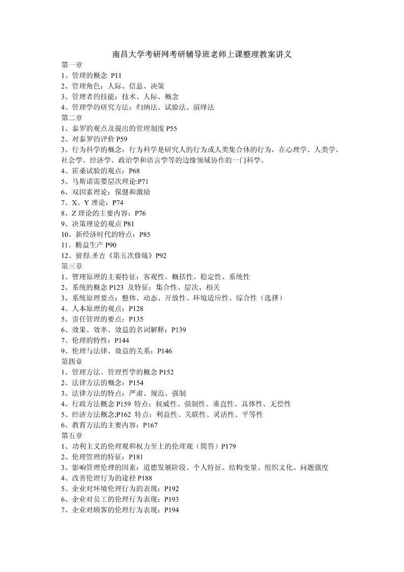 南昌大学考研网考研辅导班老师上课整理教案讲义第一章1、管理P11的概念2、管理角色:人际、信息、决策3、管理者的技能:技术、人际、概念4、管理学的研究方法:归纳法、试验法、演绎法第二章1、泰罗P55的观点及提出的管理制度2、对泰P59罗的评价3、行为行为科科学的概念学是研究人心理学、人类学、:的行为或人类集合体的行为,在社会学、经济学、政治学和语言学等的边缘领域协作的一门科学。4、霍桑P68试验的观点:5、马斯:P71诺需要层次理论6、双因素理论:保健和激励7、X、Y理论:P748、Z理论的P76主要内容