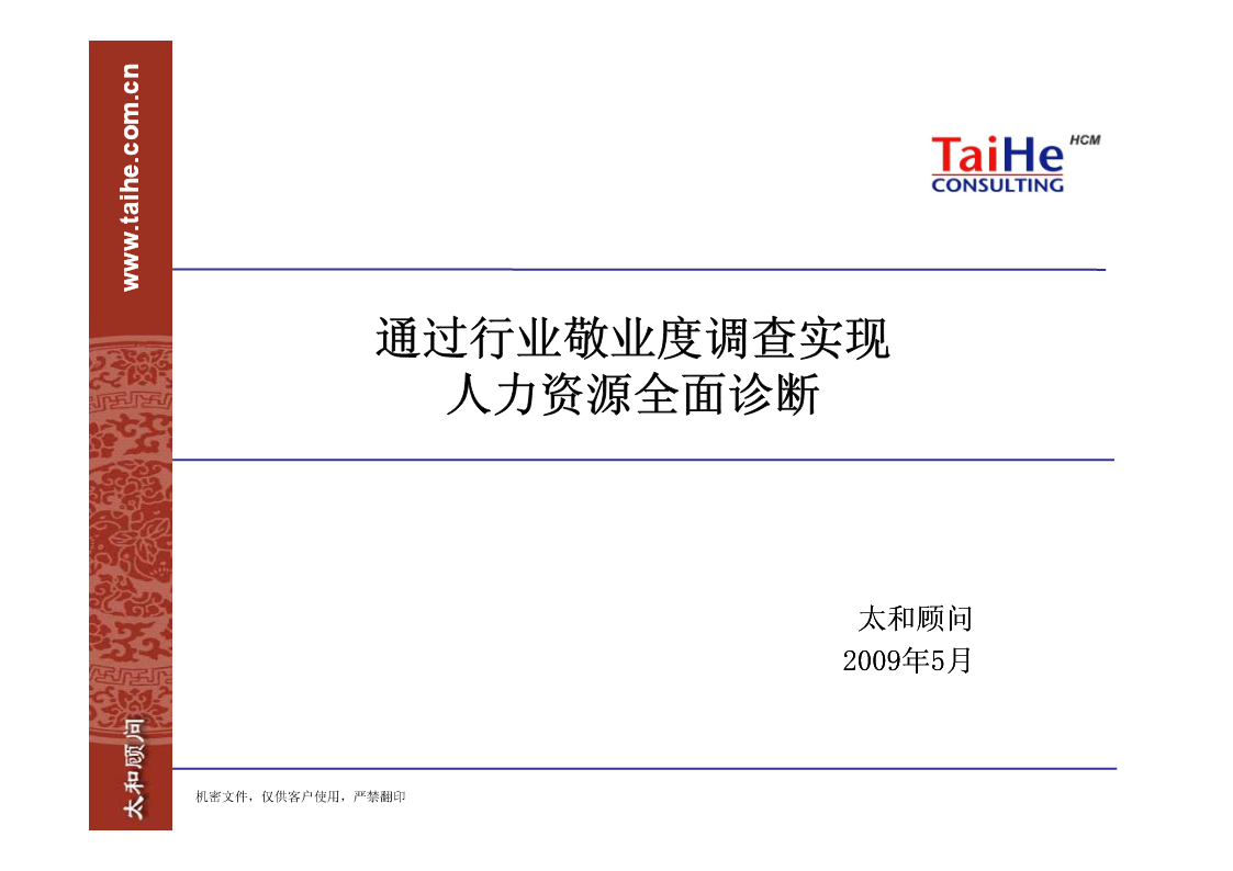 m.cnoo.taihe.cwwww通过行业敬业度调查实现人力资源全面诊断太和顾问20092009年年55月月机密文件,仅供客户使用,严禁翻印www.taihe.com.cn机密文件,仅供客户使用,严禁翻印¾关于太和顾问关于太和顾问北京外企太和企业管理顾问有限公司以服务中国地区企业为己任,通过旗下三大业务主线:即权威性行业调研及人力资源信息数据服务、专业化人力资源管理咨询服务、员工背景调查等为企业提供全方位人力资源管理咨询服务。太和顾问背景调查数据咨询部管理咨询部事业部太和团队行业调研信息+咨询方案设计强