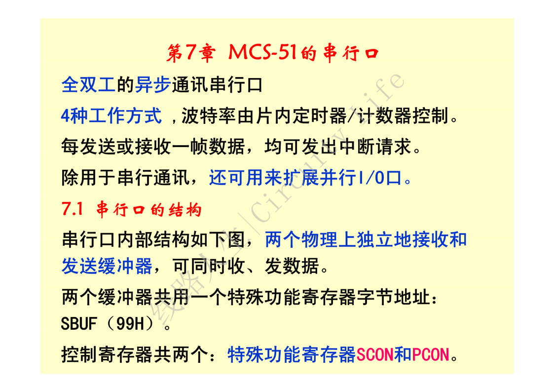 第7章MCS-51的串行口全双工的异步通讯串行口4种工作方式,波特率定时率由片内定时器/计数器控制。每发送或接收一帧数据,均可发出中断请求。除用于串行通讯,还可用来扩展并行I/O口。7.1串行口的结构串行口内部结构如下图,两个物理上独立地接收和发送缓冲器,可同时收、发数据。两个缓冲器共用一个特殊功能寄存器字节地址:SBUF(99H)。线路人生|CircuityLife控制寄存器共两个:特殊功能寄存器SCON和PCON。7.1.1串串制寄存行口控制寄存器SCON字节地址98H,可位寻址,格式如图所示。线路人
