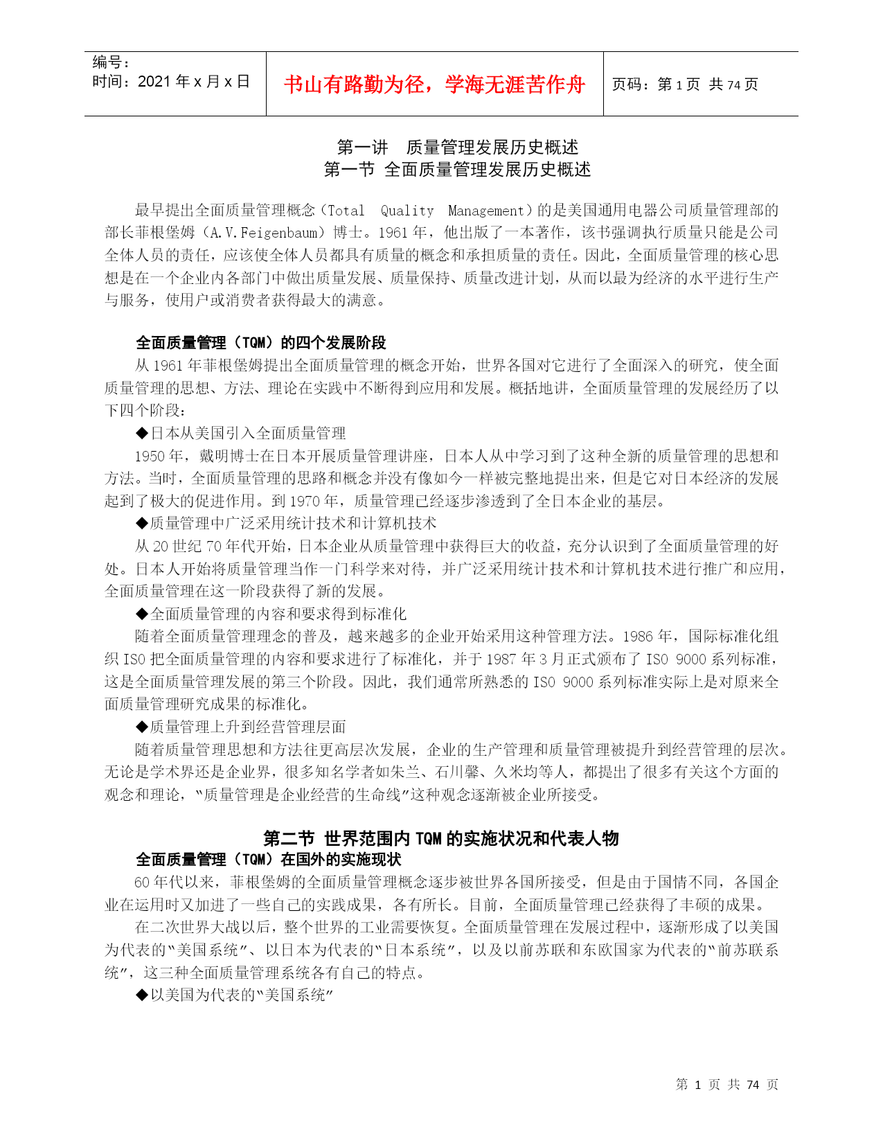 编号:时间:2021年x月x日书山有路勤为径,学海无涯苦作舟页码:第PAGE74页共NUMPAGES74页第PAGE\*MERGEFORMAT74页共NUMPAGES\*MERGEFORMAT74页第一讲质量管理发展历史概述第一节全面质量管理发展历史概述最早提出全面质量管理概念(TotalQualityManagement)的是美国通用电器公司质量管理部的部长菲根堡姆(A.V.Feigenbaum)博士。1961年,他出版了一本著作,该书强调执行质量只能是公司全体人员的责任,应该使