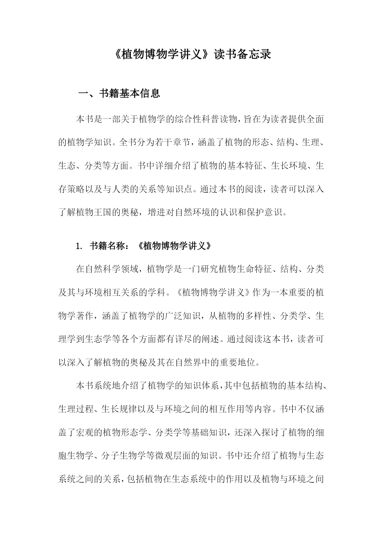 《植物博物学讲义》读书备忘录一、书籍基本信息本书是一部关于植物学的综合性科普读物,旨在为读者提供全面的植物学知识。全书分为若干章节,涵盖了植物的形态、结构、生理、生态、分类等方面。书中详细介绍了植物的基本特征、生长环境、生存策略以及与人类的关系等知识点。通过本书的阅读,读者可以深入了解植物王国的奥秘,增进对自然环境的认识和保护意识。1.书籍名称:《植物博物学讲义》在自然科学领域,植物学是一门研究植物生命特征、结构、分类及其与环境相互关系的学科。《植物博物学讲义》作为一本重要的植物学著作,涵盖了植物学的广泛